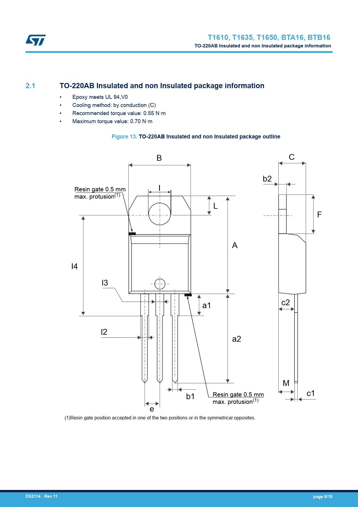 T1610, T1635, T1650, BTA16, BTB16 TO-220AB Insulated and non Insulated package information 2.1