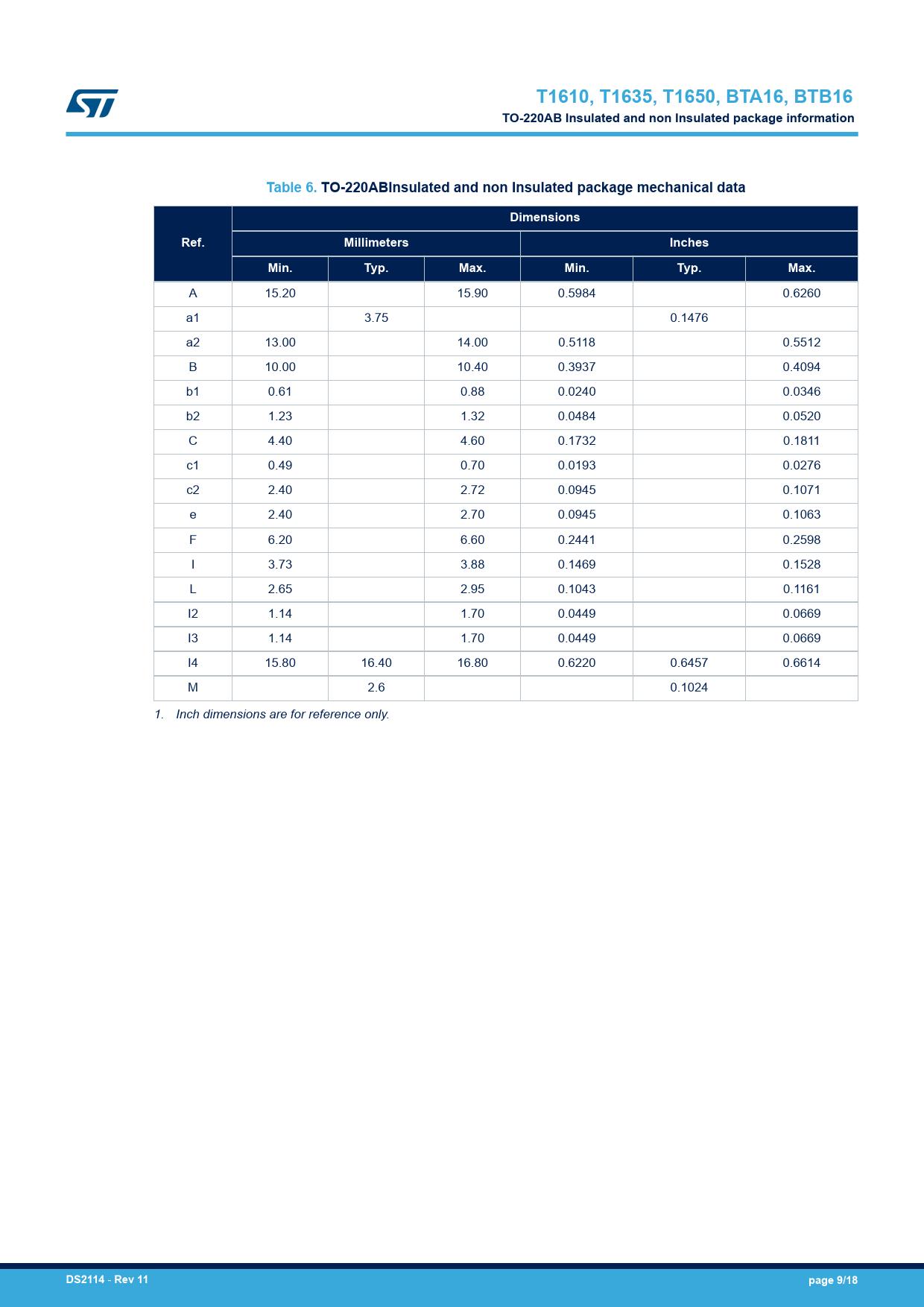 T1610, T1635, T1650, BTA16, BTB16 TO-220AB Insulated and non Insulated package information Table 6. TO-220ABInsulated and non Insulated package mechanical data Dimensions Ref. Millimeters Inches Min. Typ. Max. Min. Typ. Max.