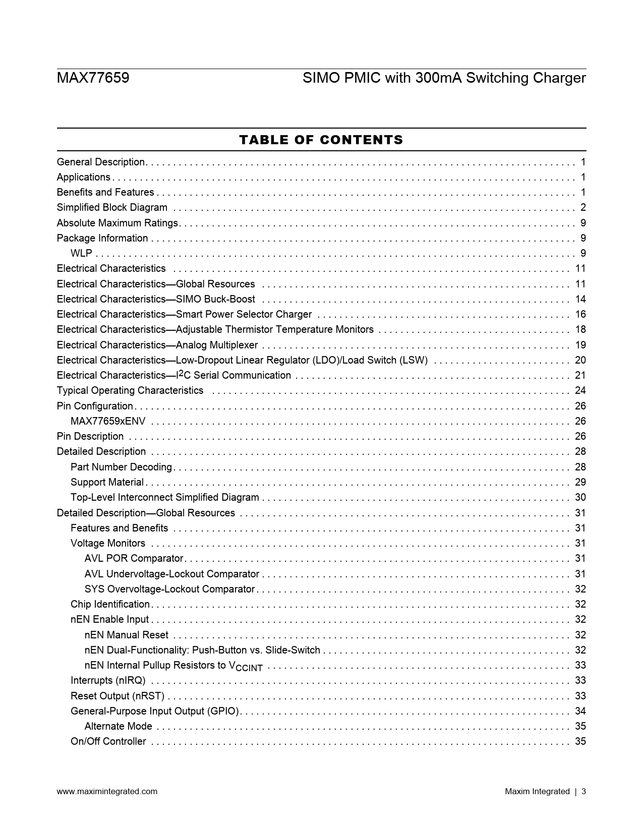 link to page 1 link to page 1 link to page 1 link to page 2 link to page 9 link to page 9 link to page 9 link to page 11 link to page 11 link to page 14 link to page 16 link to page 18 link to page 19 link to page 20 link to page 21 link to page 21 link to page 24 link to page 26 link to page 26 link to page 26 link to page 28 link to page 28 link to page 29 link to page 30 link to page 31 link to page 31 link to page 31 link to page 31 link to page 31 link to page 32 link to page 32 link to page 32 link to page 32 link to page 32 link to page 33 link to page 33 link to page 33 link to page 33 link to page 34 link to page 35 link to page 35 MAX77659 SIMO PMIC with 300mA Switching Charger TABLE OF CONTENTS General Description . 1 Applications . 1 Benefits and Features . 1 Simplified Block Diagram . 2 Absolute Maximum Ratings . 9 Package Information . 9 WLP . 9 Electrical Characteristics . 11 Electrical Characteristics—Global Resources . 11 Electrical Characteristics—SIMO Buck-Boost . 14 Electrical Characteristics—Smart Power Selector Charger . 16 Electrical Characteristics—Adjustable Thermistor Temperature Monitors . 18 Electrical Characteristics—Analog Multiplexer . 19 Electrical Characteristics—Low-Dropout Linear Regulator (LDO)/Load Switch (LSW) . 20 Electrical Characteristics—I2C Serial Communication . 21 Typical Operating Characteristics . 24 Pin Configuration . 26 MAX77659xENV . 26 Pin Description . 26 Detailed Description . 28 Part Number Decoding . 28 Support Material . 29 Top-Level Interconnect Simplified Diagram . 30 Detailed Description—Global Resources . 31 Features and Benefits . 31 Voltage Monitors . 31 AVL POR Comparator . 31 AVL Undervoltage-Lockout Comparator . 31 SYS Overvoltage-Lockout Comparator . 32 Chip Identification . 32 nEN Enable Input . 32 nEN Manual Reset . 32 nEN Dual-Functionality: Push-Button vs. Slide-Switch . 32 nEN Internal Pullup Resistors to VCCINT . 33 Interrupts (nIRQ) . 33 Reset Output (nRST) . 33 General-Purpose Input Output (GPIO) . 34 Alternate Mode . 35 On/Off Controller . 35 www.maximintegrated.com Maxim Integrated | 3 Document Outline General Description Applications Benefits and Features Simplified Block Diagram Absolute Maximum Ratings Package Information WLP Electrical Characteristics Electrical Characteristics—Global Resources Electrical Characteristics—Global Resources (continued) Electrical Characteristics—SIMO Buck-Boost Electrical Characteristics—SIMO Buck-Boost (continued) Electrical Characteristics—Smart Power Selector Charger Electrical Characteristics—Smart Power Selector Charger (continued) Electrical Characteristics—Adjustable Thermistor Temperature Monitors Electrical Characteristics—Adjustable Thermistor Temperature Monitors (continued) Electrical Characteristics—Analog Multiplexer Electrical Characteristics—Analog Multiplexer (continued) Electrical Characteristics—Low-Dropout Linear Regulator (LDO)/Load Switch (LSW) Electrical Characteristics—Low-Dropout Linear Regulator (LDO)/Load Switch (LSW) (continued) Electrical Characteristics—I2C Serial Communication Electrical Characteristics—I2C Serial Communication (continued) Typical Operating Characteristics Typical Operating Characteristics (continued) Pin Configuration MAX77659xENV Pin Description Pin Description (continued) Detailed Description Part Number Decoding Support Material Top-Level Interconnect Simplified Diagram Detailed Description—Global Resources Features and Benefits Voltage Monitors AVL POR Comparator AVL Undervoltage-Lockout Comparator SYS Overvoltage-Lockout Comparator Chip Identification nEN Enable Input nEN Manual Reset nEN Dual-Functionality: Push-Button vs. Slide-Switch nEN Internal Pullup Resistors to VCCINT Interrupts (nIRQ) Reset Output (nRST) General-Purpose Input Output (GPIO) Alternate Mode On/Off Controller Top Level On/Off Controller On/Off Controller Transition Table Internal Wake-Up Flags Reset and Off Sequences Power-Up/Down Sequence Flexible Power Sequencer (FPS) Startup Timing Diagram Due to nEN Startup Timing Diagram Due to Charge Source Insertion Force Enabled/Disabled Channels Factory-Ship Mode State Debounced Inputs (nEN, GPI, CHGIN) Watchdog Timer (WDT) Detailed Description—SIMO Buck-Boost SIMO Features and Benefits SIMO Detailed Block Diagram SIMO Control Scheme Drive Strength SIMO Soft-Start SIMO Registers SIMO Active Discharge Resistance SIMO Buck Mode Applications Information SIMO Available Output Current Inductor Selection Input Capacitor Selection Boost Capacitor Selection Output Capacitor Selection Example Component Selection Inductor, Peak Current Limit, and Input Capacitor Output Capacitors Summary SIMO Switching Frequency Unused Outputs PCB Layout Guide Capacitors Input Capacitor at IN_SBB Output Capacitors at SBBx Inductor Ground Connections Detailed Description—Smart Power Selector Charger Switching Charger Implementation with SIMO Architecture Charger Symbol Reference Guide Smart Power Selector Die Temperature Regulation Charger State Machine Charger-Off State Prequalification State Fast-Charge States Headroom Control Top-Off State Done State Prequalification Timer Fault State Fast-Charge Timer Fault State Battery Temperature Fault State JEITA-Modified States Typical Charge Profile Charger Applications Information CHGIN/SYS/BATT Capacitor Selection Detailed Description—Adjustable Thermistor Temperature Monitors Thermistor Bias Configurable Temperature Thresholds Applications Information Using Different Thermistor β NTC Thermistor Selection Detailed Description—Analog Multiplexer Measuring Battery Current Method for Measuring Discharge Current Method for Measuring Charge Current Detailed Description—Low-Dropout Linear Regulator (LDO)/Load Switch (LSW) Features and Benefits LDO/LSW Simplified Block Diagram LDO/LSW Active-Discharge Resistor LDO/LSW Soft-Start Load Switch Configuration Applications Information Input Capacitor Selection Output Capacitor Selection Detailed Desc