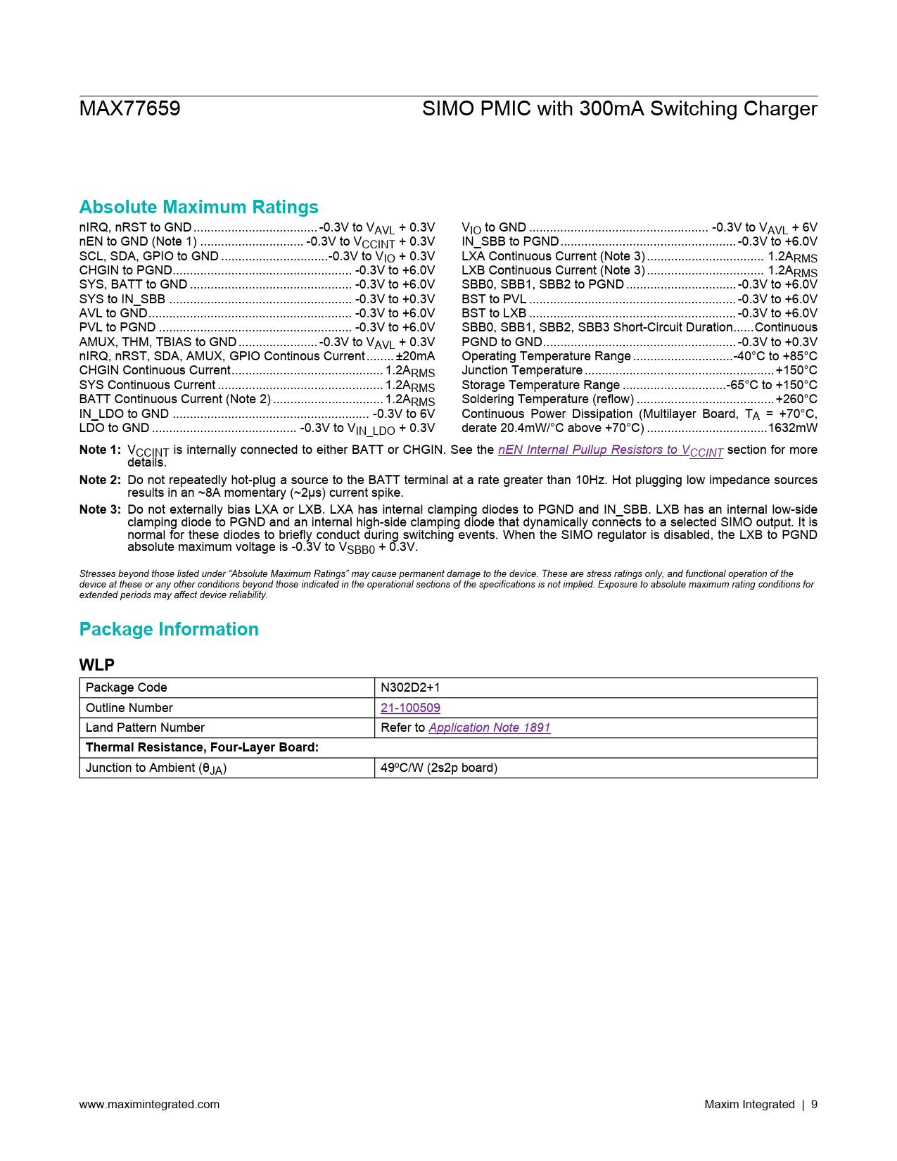 link to page 33 link to page 33 MAX77659 SIMO PMIC with 300mA Switching Charger Absolute Maximum Ratings nIRQ, nRST to GND .. -0.3V to VAVL + 0.3V VIO to GND .. -0.3V to VAVL + 6V nEN to GND (Note 1) .. -0.3V to VCCINT + 0.3V IN_SBB to PGND ... -0.3V to +6.0V SCL, SDA, GPIO to GND ...-0.3V to VIO + 0.3V LXA Continuous Current (Note 3) .. 1.2ARMS CHGIN to PGND .. -0.3V to +6.0V LXB Continuous Current (Note 3) .. 1.2ARMS SYS, BATT to GND ... -0.3V to +6.0V SBB0, SBB1, SBB2 to PGND .. -0.3V to +6.0V SYS to IN_SBB ... -0.3V to +0.3V BST to PVL .. -0.3V to +6.0V AVL to GND ... -0.3V to +6.0V BST to LXB .. -0.3V to +6.0V PVL to PGND .. -0.3V to +6.0V SBB0, SBB1, SBB2, SBB3 Short-Circuit Duration ..Continuous AMUX, THM, TBIAS to GND ... -0.3V to VAVL + 0.3V PGND to GND .. -0.3V to +0.3V nIRQ, nRST, SDA, AMUX, GPIO Continous Current .. ±20mA Operating Temperature Range ...-40°C to +85°C CHGIN Continuous Current .. 1.2ARMS Junction Temperature ... +150°C SYS Continuous Current .. 1.2ARMS Storage Temperature Range ..-65°C to +150°C BATT Continuous Current (Note 2) .. 1.2ARMS Soldering Temperature (reflow) ..+260°C IN_LDO to GND ... -0.3V to 6V Continuous Power Dissipation (Multilayer Board, TA = +70°C, LDO to GND .. -0.3V to VIN_LDO + 0.3V derate 20.4mW/°C above +70°C) ...1632mW Note 1: VCCINT is internally connected to either BATT or CHGIN. See the nEN Internal Pullup Resistors to VCCINT section for more details. Note 2: Do not repeatedly hot-plug a source to the BATT terminal at a rate greater than 10Hz. Hot plugging low impedance sources results in an ~8A momentary (~2μs) current spike. Note 3: Do not externally bias LXA or LXB. LXA has internal clamping diodes to PGND and IN_SBB. LXB has an internal low-side clamping diode to PGND and an internal high-side clamping diode that dynamically connects to a selected SIMO output. It is normal for these diodes to briefly conduct during switching events. When the SIMO regulator is disabled, the LXB to PGND absolute maximum voltage is -0.3V to VSBB0 + 0.3V. Stresses beyond those listed under “Absolute Maximum Ratings” may cause permanent damage to the device. These are stress ratings only, and functional operation of the device at these or any other conditions beyond those indicated in the operational sections of the specifications is not implied. Exposure to absolute maximum rating conditions for extended periods may affect device reliability. Package InformationWLP Package Code N302D2+1 Outline Number 21-100509 Land Pattern Number Refer to Application Note 1891 Thermal Resistance, Four-Layer Board: Junction to Ambient (θJA) 49ºC/W (2s2p board) www.maximintegrated.com Maxim Integrated | 9 Document Outline General Description Applications Benefits and Features Simplified Block Diagram Absolute Maximum Ratings Package Information WLP Electrical Characteristics Electrical Characteristics—Global Resources Electrical Characteristics—Global Resources (continued) Electrical Characteristics—SIMO Buck-Boost Electrical Characteristics—SIMO Buck-Boost (continued) Electrical Characteristics—Smart Power Selector Charger Electrical Characteristics—Smart Power Selector Charger (continued) Electrical Characteristics—Adjustable Thermistor Temperature Monitors Electrical Characteristics—Adjustable Thermistor Temperature Monitors (continued) Electrical Characteristics—Analog Multiplexer Electrical Characteristics—Analog Multiplexer (continued) Electrical Characteristics—Low-Dropout Linear Regulator (LDO)/Load Switch (LSW) Electrical Characteristics—Low-Dropout Linear Regulator (LDO)/Load Switch (LSW) (continued) Electrical Characteristics—I2C Serial Communication Electrical Characteristics—I2C Serial Communication (continued) Typical Operating Characteristics Typical Operating Characteristics (continued) Pin Configuration MAX77659xENV Pin Description Pin Description (continued) Detailed Description Part Number Decoding Support Material Top-Level Interconnect Simplified Diagram Detailed Description—Global Resources Features and Benefits Voltage Monitors AVL POR Comparator AVL Undervoltage-Lockout Comparator SYS Overvoltage-Lockout Comparator Chip Identification nEN Enable Input nEN Manual Reset nEN Dual-Functionality: Push-Button vs. Slide-Switch nEN Internal Pullup Resistors to VCCINT Interrupts (nIRQ) Reset Output (nRST) General-Purpose Input Output (GPIO) Alternate Mode On/Off Controller Top Level On/Off Controller On/Off Controller Transition Table Internal Wake-Up Flags Reset and Off Sequences Power-Up/Down Sequence Flexible Power Sequencer (FPS) Startup Timing Diagram Due to nEN Startup Timing Diagram Due to Charge Source Insertion Force Enabled/Disabled Channels Factory-Ship Mode State Debounced Inputs (nEN, GPI, CHGIN) Watchdog Timer (WDT) Detailed Description—SIMO Buck-Boost SIMO Features and Benefits SIMO Detailed Block Diagram SIMO Control Scheme Drive Strength SIMO Soft-Start SIMO Registers SIMO Active Discharge Resistance SIMO Buck Mode Applications Information SIMO Available Output Current Inductor Selection Input Capacitor Selection Boost Capacitor Selection Output Capacitor Selection Example Component Selection Inductor, Peak Current Limit, and Input Capacitor Output Capacitors Summary SIMO Switching Frequency Unused Outputs PCB Layout Guide Capacitors Input Capacitor at IN_SBB Output Capacitors at SBBx Inductor Ground Connections Detailed Description—Smart Power Selector Charger Switching Charger Implementation with SIMO Architecture Charger Symbol Reference Guide Smart Power Selector Die Temperature Regulation Charger State Machine Charger-Off State Prequalification State Fast-Charge States Headroom Control Top-Off State Done State Prequalification Timer Fault State Fast-Charge Timer Fault State Battery Temperature Fault State JEITA-Modified States Typical Charge Profile Charger Applications Information CHGIN/SYS/BATT Capacitor Selection Detailed Description—Adjustable Thermistor Temperature Monitors T