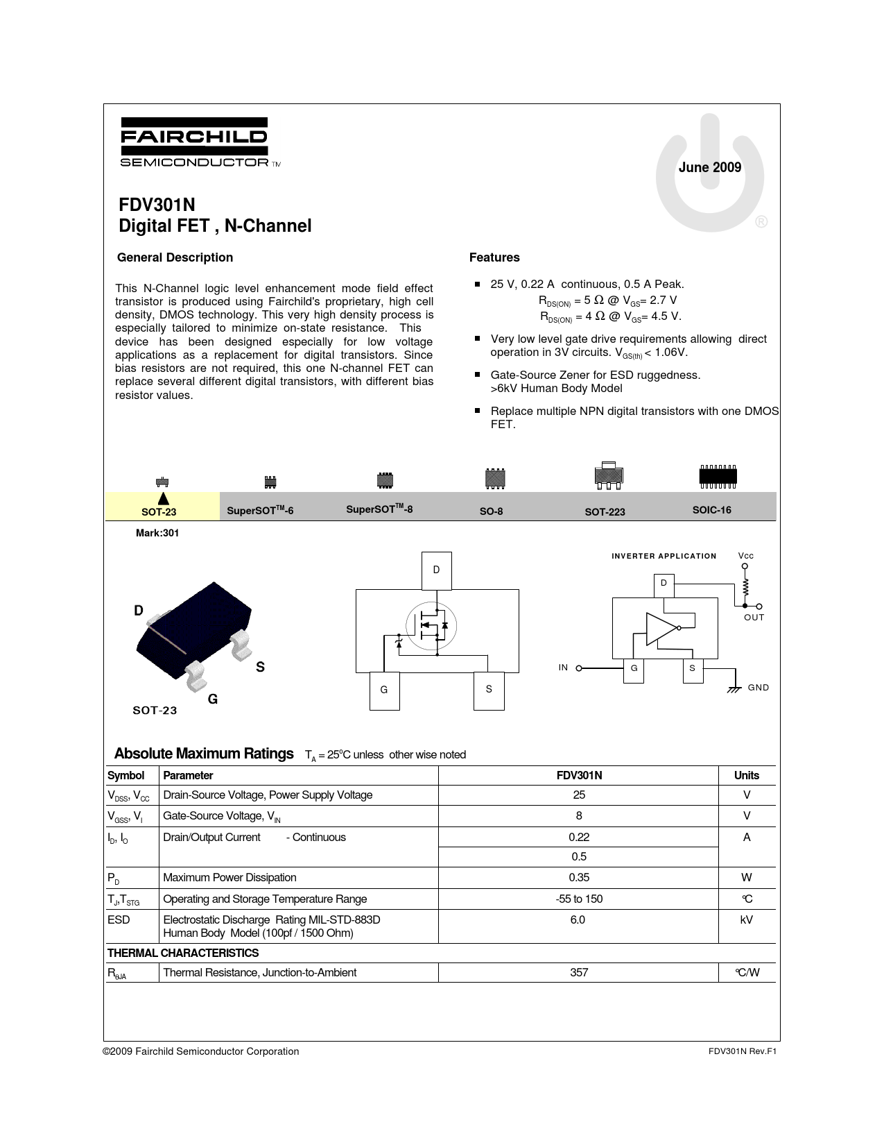 June 2009. FDV301N Digital FET , N-Channel. General Description Features. SOT-23. SuperSOTTM-6. SuperSOTTM-8. SO-8. SOT-223. SOIC-16