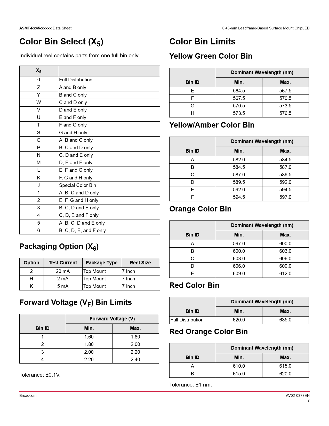 A 610.0 615.0 Tolerance: ±0.1V. B 615.0 620.0 Tolerance: ±1 nm. Broadcom AV02-0378EN 7 Document Outline Description Features Applications Package Dimensions Device Selection Guide Part Numbering System Absolute Maximum Ratings at TA = 25°C Electrical Characteristics at TA = 25°C Optical Characteristics at TA = 25°C Intensity Bin Select (X3X4) Light Intensity (IV) Bin Limits Color Bin Select (X5) Packaging Option (X6) Forward Voltage (VF) Bin Limits Color Bin Limits Yellow Green Color Bin Yellow/Amber Color Bin Orange Color Bin Red Color Bin Red Orange Color Bin Moisture Sensitivity