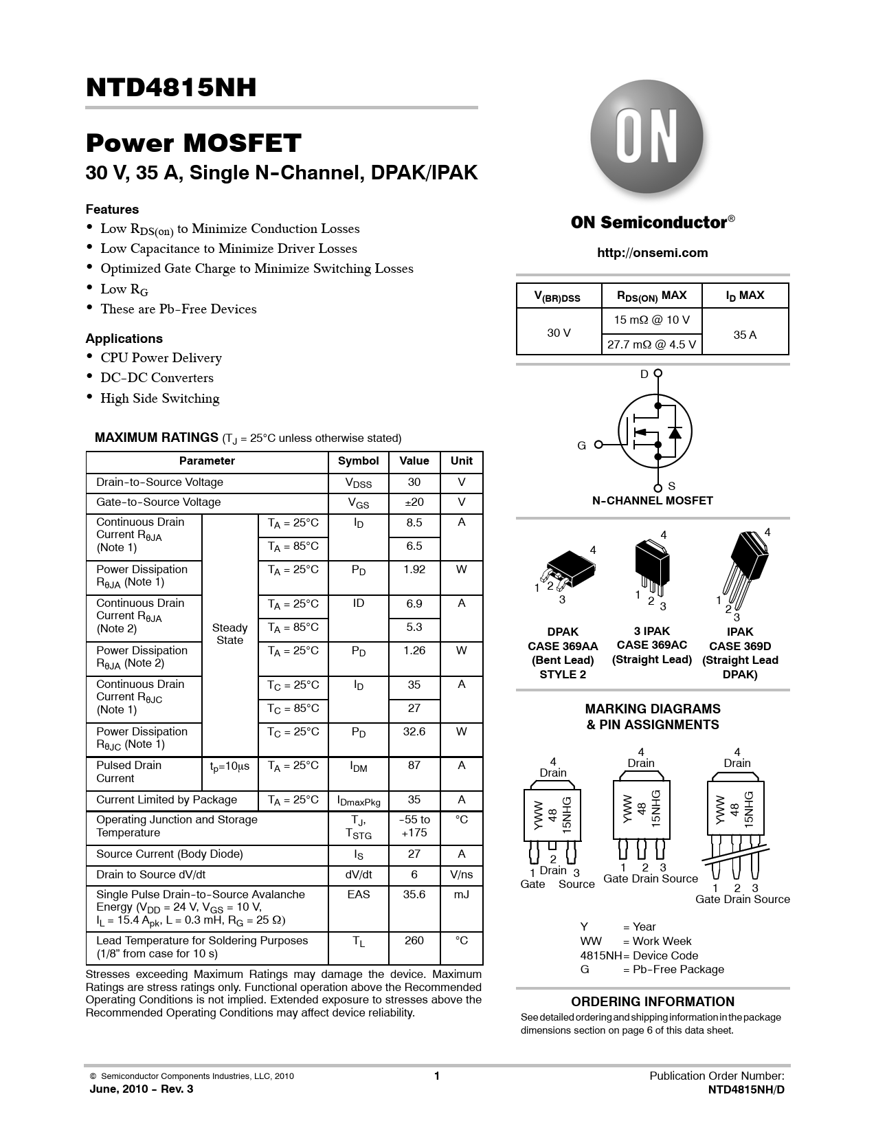 30 V, 35 A, Single N- Channel, DPAK/IPAK. Features. http://onsemi.com. V(BR)DSS. RDS(ON) MAX. ID MAX. Applications. MAXIMUM RATINGS