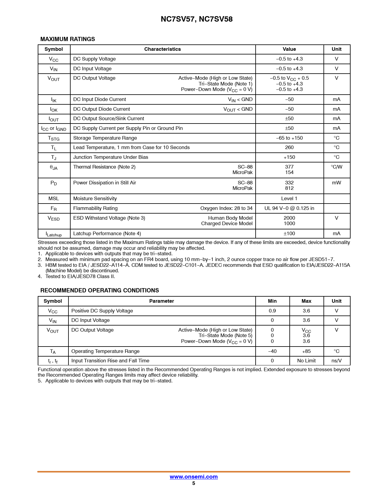 NC7SV57, NC7SV58. MAXIMUM RATINGS. Symbol. Characteristics. Value. Unit. RECOMMENDED OPERATING CONDITIONS. Parameter. Min. Max
