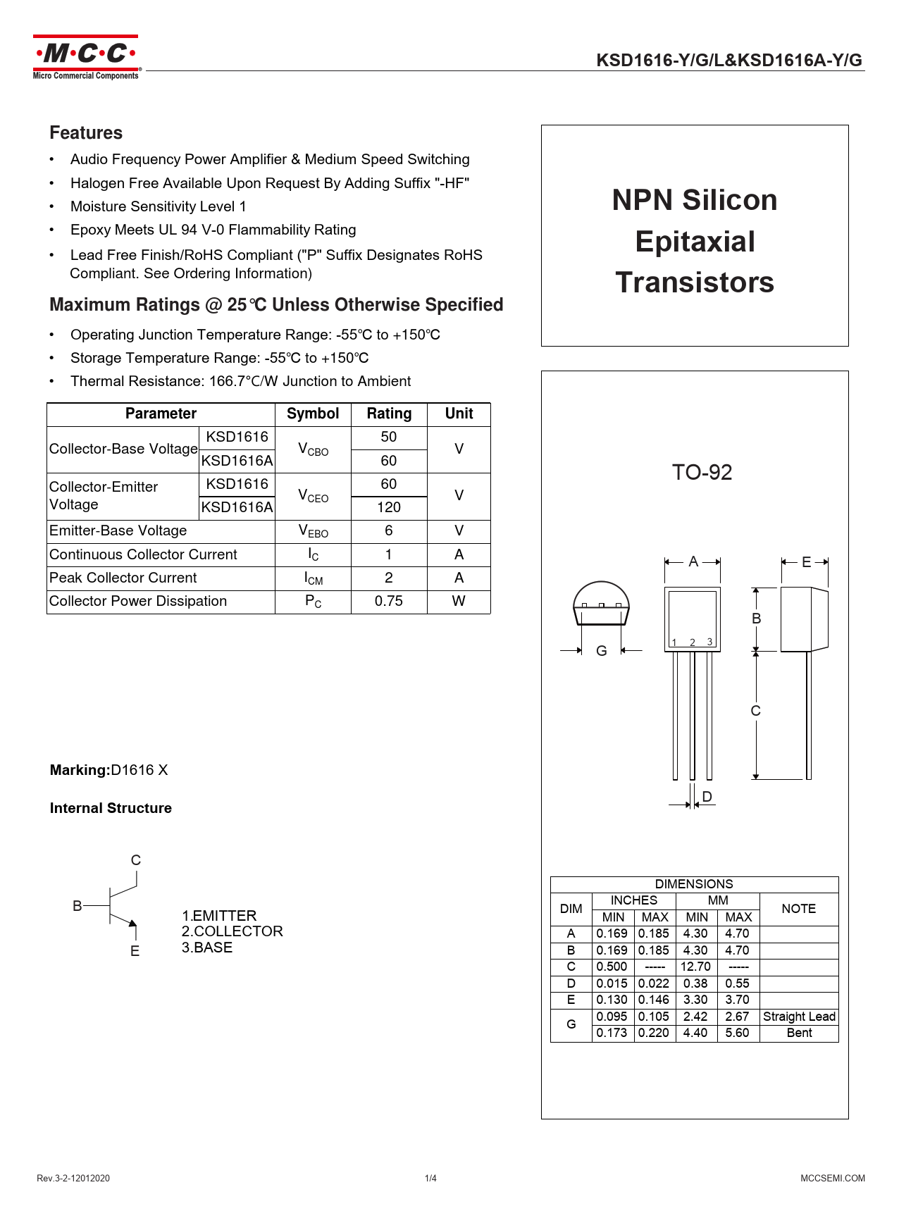 Datasheet KSD1616-Y/G/L, KSD1616A-Y/G MCC