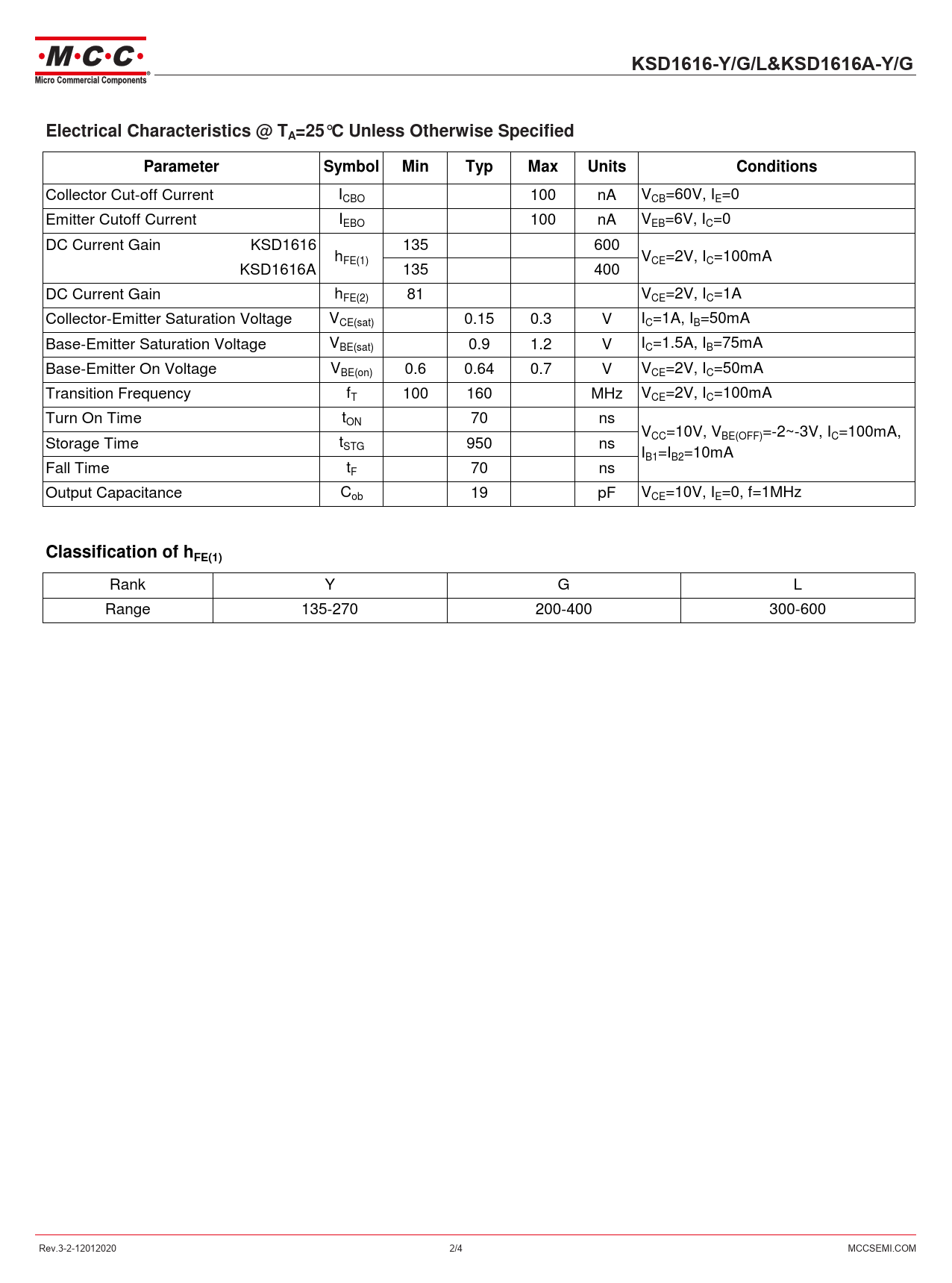 KSD1616-Y/G/L&KSD1616A-Y/GElectrical Characteristics @ TA=25°C Unless Otherwise SpecifiedParameterSymbolMinTypMaxUnitsConditions Collector Cut-off Current ICBO 100 nA VCB=60V, IE=0 Emitter Cutoff Current IEBO 100 nA VEB=6V, IC=0 DC Current Gain KSD1616 135 600 hFE(1) VCE=2V, IC=100mA KSD1616A 135 400 DC Current Gain hFE(2) 81 VCE=2V, IC=1A Collector-Emitter Saturation Voltage V I CE(sat) 0.15 0.3 V C=1A, IB=50mA Base-Emitter Saturation Voltage VBE(sat) 0.9 1.2 V IC=1.5A, IB=75mA Base-Emitter On Voltage VBE(on) 0.6 0.64 0.7 V VCE=2V, IC=50mA Transition Frequency fT 100 160 MHz VCE=2V, IC=100mA Turn On Time tON 70 ns VCC=10V, VBE(OFF)=-2~-3V, IC=100mA, Storage Time tSTG 950 ns IB1=IB2=10mA Fall Time tF 70 ns Output Capacitance C 19 pF V ob CE=10V, IE=0, f=1MHz Classification of hFE(1) Rank Y G L Range 135-270 200-400 300-600 Rev.3-2-12012020 2/4 MCCSEMI.COM Document Outline 空白页面