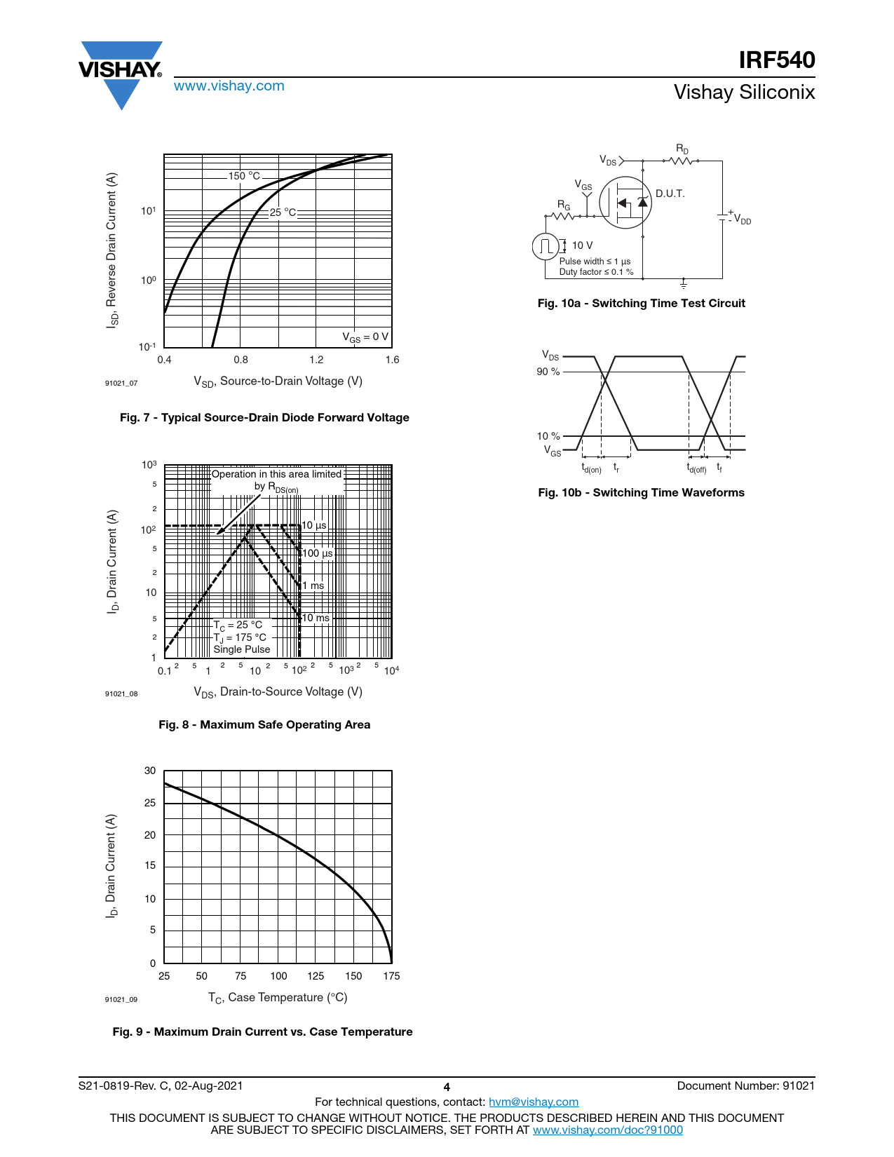 IRF540 www.vishay.com Vishay Siliconix RD VDS 150 °C VGS D.U.T. R 101 25 °C G + - VDD ain Current (A) 10 V Pulse width ≤ 1 µs Duty factor ≤ 0.1 % 100 erse Dr v Fig. 10a - Switching Time Test Circuit , Re I SD V = 0 V GS 10-1 V 0.4 0.8 1.2 1.6 DS 90 % 91021_07 VSD, Source-to-Drain Voltage (V) Fig. 7 - Typical Source-Drain Diode Forward Voltage 10 % VGS 103 t t t t Operation in this area limited d(on) r d(off) f 5 by RDS(on) Fig. 10b - Switching Time Waveforms 2 10 µs 102 5 100 µs 2 ain Current (A) 1 ms 10 , Dr I D 5 10 ms T = 25 ° C C 2 T = 175 ° C J Single Pulse 1 2 5 2 5 2 5 2 5 0.1 1 10 102 103 2 5 104 91021_08 VDS, Drain-to-Source Voltage (V) Fig. 8 - Maximum Safe Operating Area 30 25 20 15 ain Current (A) 10 , Dr I D 5 0 25 50 75 100 125 150 175 91021_09 TC, Case Temperature (°C) Fig. 9 - Maximum Drain Current vs. Case Temperature S21-0819-Rev. C, 02-Aug-2021 4 Document Number: 91021 For technical questions, contact: hvm@vishay.com THIS DOCUMENT IS SUBJECT TO CHANGE WITHOUT NOTICE. THE PRODUCTS DESCRIBED HEREIN AND THIS DOCUMENT ARE SUBJECT TO SPECIFIC DISCLAIMERS, SET FORTH AT www.vishay.com/doc?91000