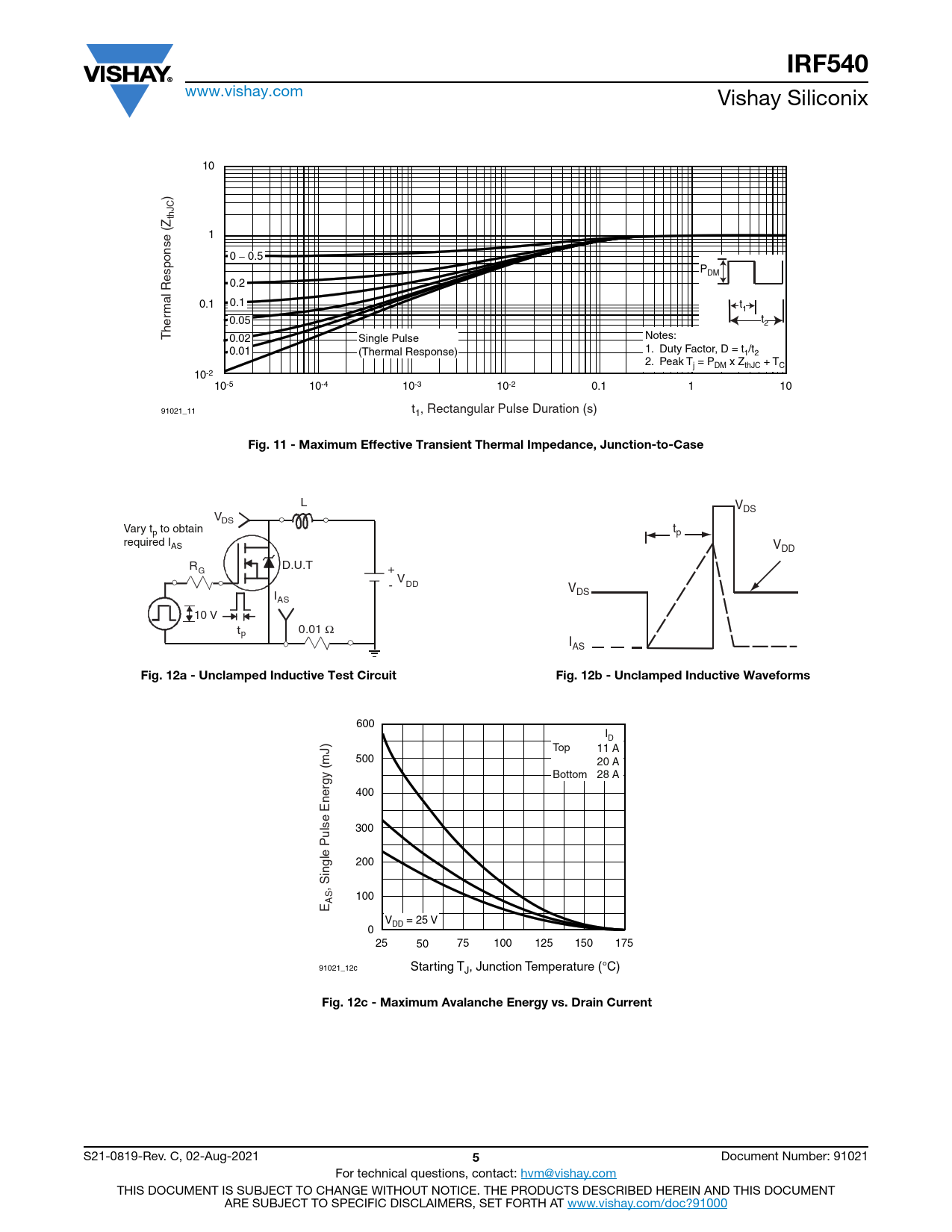 IRF540 www.vishay.com Vishay Siliconix 10 ) thJC 1 0 − 0.5 PDM 0.2 0.1 0.1 t1 mal Response (Z t 0.05 2 Ther Notes: 0.02 Single Pulse 1. Duty Factor, D = t /t 0.01 (Thermal Response) 1 2 2. Peak T = P x Z + T j DM thJC C 10-2 10-5 10-4 10-3 10-2 0.1 1 10 91021_11 t1, Rectangular Pulse Duration (s) Fig. 11 - Maximum Effective Transient Thermal Impedance, Junction-to-Case L VDS VDS Vary t t p to obtain p required IAS VDD R D.U.T G + V - DD V I DS AS 10 V t 0.01 p Ω IAS Fig. 12a - Unclamped Inductive Test CircuitFig. 12b - Unclamped Inductive Waveforms 600 ID Top 11 A 500 20 A Bottom 28 A 400 300 200 , Single Pulse Energy (mJ) 100 ASE V = 25 V DD 0 25 50 75 100 125 150 175 91021_12c Starting TJ, Junction Temperature (°C) Fig. 12c - Maximum Avalanche Energy vs. Drain Current S21-0819-Rev. C, 02-Aug-2021 5 Document Number: 91021 For technical questions, contact: hvm@vishay.com THIS DOCUMENT IS SUBJECT TO CHANGE WITHOUT NOTICE. THE PRODUCTS DESCRIBED HEREIN AND THIS DOCUMENT ARE SUBJECT TO SPECIFIC DISCLAIMERS, SET FORTH AT www.vishay.com/doc?91000