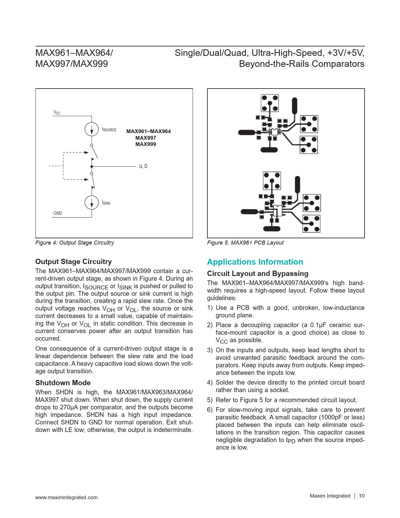 MAX961–MAX964/ Single/Dual/Quad, Ultra-High-Speed, +3V/+5V, MAX997/MAX999 Beyond-the-Rails Comparators VCC ISOURCE MAX961–MAX964MAX997MAX999 Q, Q ISINK GND Figure 4. Output Stage Circuitry Figure 5. MAX961 PCB Layout Output Stage CircuitryApplications Information The MAX961–MAX964/MAX997/MAX999 contain a cur- Circuit Layout and Bypassing rent-driven output stage, as shown in Figure 4. During an output transition, I The MAX961–MAX964/MAX997/MAX999’s high band- SOURCE or ISINK is pushed or pulled to the output pin. The output source or sink current is high width requires a high-speed layout. Follow these layout during the transition, creating a rapid slew rate. Once the guidelines: output voltage reaches VOH or VOL, the source or sink 1) Use a PCB with a good, unbroken, low-inductance current decreases to a small value, capable of maintain- ground plane. ing the VOH or VOL in static condition. This decrease in 2) Place a decoupling capacitor (a 0.1μF ceramic sur- current conserves power after an output transition has face-mount capacitor is a good choice) as close to occurred. VCC as possible. One consequence of a current-driven output stage is a 3) On the inputs and outputs, keep lead lengths short to linear dependence between the slew rate and the load avoid unwanted parasitic feedback around the com- capacitance. A heavy capacitive load slows down the volt- parators. Keep inputs away from outputs. Keep imped- age output transition. ance between the inputs low. Shutdown Mode 4) Solder the device directly to the printed circuit board When SHDN is high, the MAX961/MAX963/MAX964/ rather than using a socket. MAX997 shut down. When shut down, the supply current 5) Refer to Figure 5 for a recommended circuit layout. drops to 270μA per comparator, and the outputs become 6) For slow-moving input signals, take care to prevent high impedance. SHDN has a high input impedance. parasitic feedback. A small capacitor (1000pF or less) Connect SHDN to GND for normal operation. Exit shut- placed between the inputs can help eliminate oscil- down with LE low; otherwise, the output is indeterminate. lations in the transition region. This capacitor causes negligible degradation to tPD when the source imped- ance is low. www.maximintegrated.com Maxim Integrated │ 10