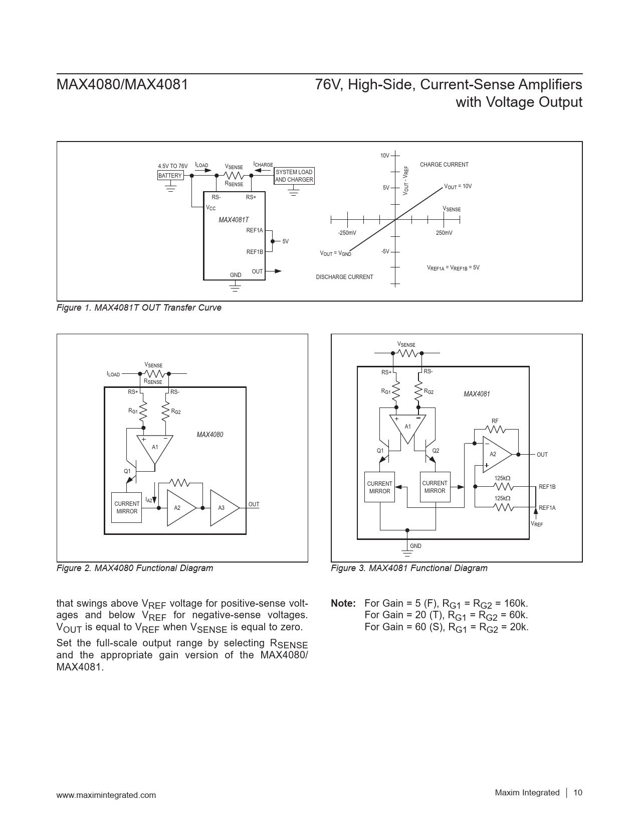 MAX4080/MAX4081 76V, High-Side, Current-Sense Amplifiers with Voltage Output 10V I 4.5V TO 76V LOAD V I SENSE CHARGE CHARGE CURRENT SYSTEM LOAD BATTERY REF R AND CHARGER - V SENSE V 5V OUT = 10V RS- RS+ V OUT VCC VSENSE MAX4081T REF1A -250mV 250mV 5V REF1B VOUT = VGND -5V VREF1A = VREF1B = 5V GND OUT DISCHARGE CURRENT Figure 1. MAX4081T OUT Transfer Curve VSENSE VSENSE I RS+ RS- LOAD RSENSE RS+ RS- RG1 RG2 MAX4081 RG1 RG2 RF A1 MAX4080 A1 Q1 Q2 A2 OUT Q1 125kΩ CURRENT CURRENT REF1B MIRROR MIRROR I 125kΩ CURRENT A2 OUT A2 A3 REF1A MIRROR VREF GND Figure 2. MAX4080 Functional Diagram Figure 3. MAX4081 Functional Diagram that swings above VREF voltage for positive-sense volt- Note: For Gain = 5 (F), RG1 = RG2 = 160k. ages and below VREF for negative-sense voltages. For Gain = 20 (T), RG1 = RG2 = 60k. VOUT is equal to VREF when VSENSE is equal to zero. For Gain = 60 (S), RG1 = RG2 = 20k. Set the full-scale output range by selecting RSENSE and the appropriate gain version of the MAX4080/ MAX4081. www.maximintegrated.com Maxim Integrated │ 10