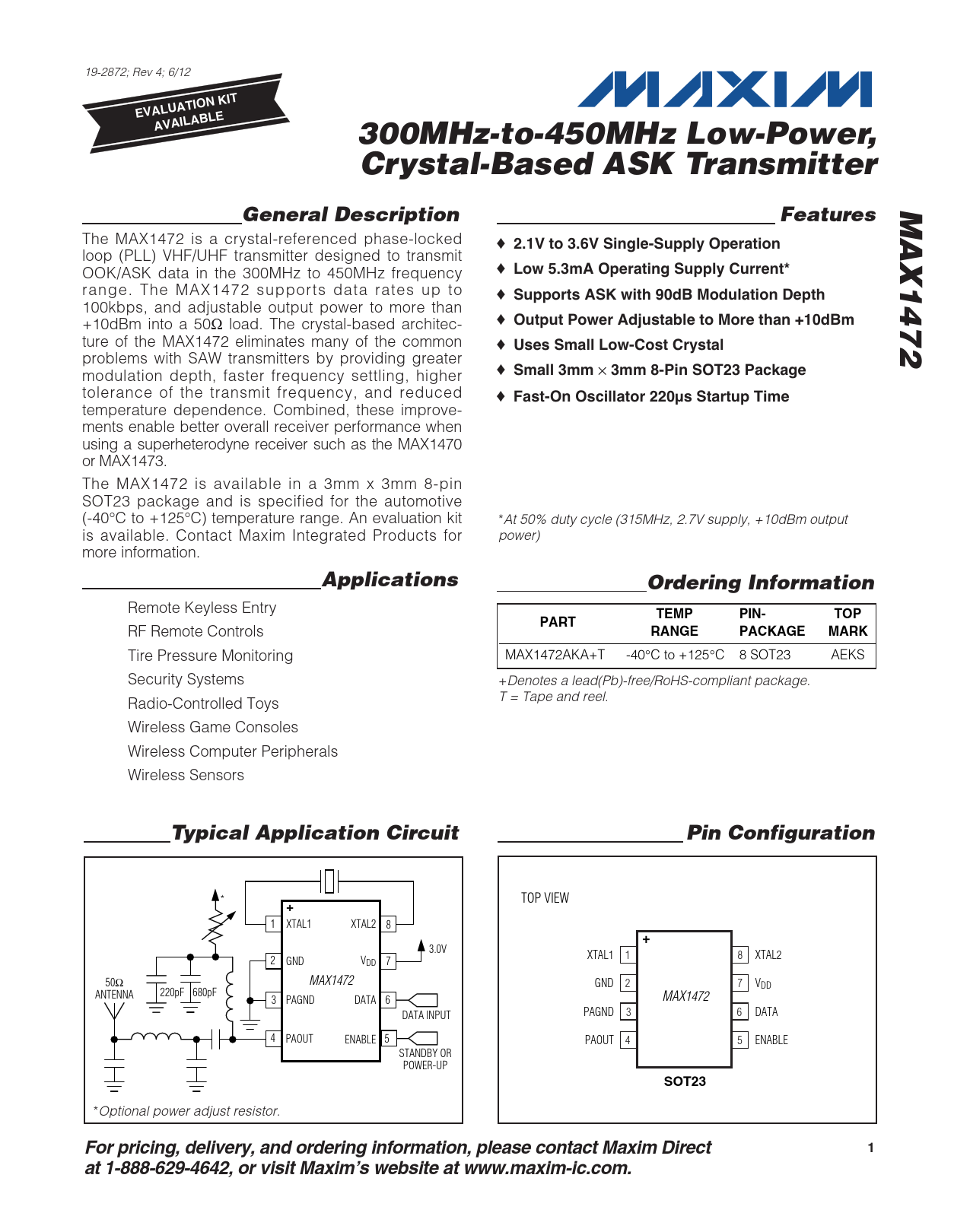 EVALUATION KIT. AVAILABLE. 300MHz-to-450MHz Low-Power,. Crystal-Based ASK Transmitter. MAX1472. General Description. Features