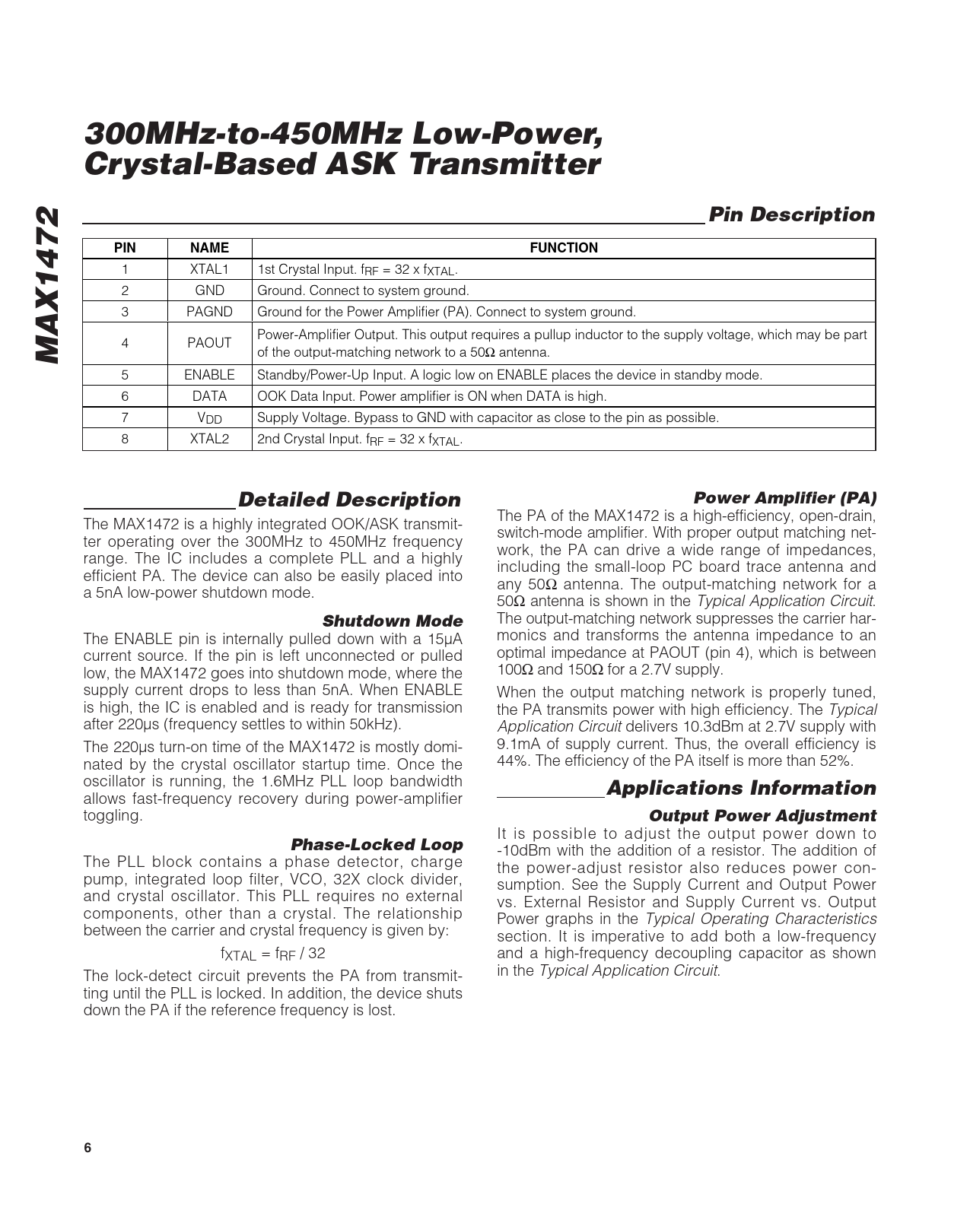 300MHz-to-450MHz Low-Power, Crystal-Based ASK TransmitterPin DescriptionPINNAMEFUNCTION 1 XTAL1 1st Crystal Input. fRF = 32 x fXTAL. 2 GND Ground. Connect to system ground. 3 PAGND Ground for the Power Amplifier (PA). Connect to system ground. Power-Amplifier Output. This output requires a pullup inductor to the supply voltage, which may be part MAX1472 4 PAOUT of the output-matching network to a 50Ω antenna. 5 ENABLE Standby/Power-Up Input. A logic low on ENABLE places the device in standby mode. 6 DATA OOK Data Input. Power amplifier is ON when DATA is high. 7 VDD Supply Voltage. Bypass to GND with capacitor as close to the pin as possible. 8 XTAL2 2nd Crystal Input. fRF = 32 x fXTAL. Detailed DescriptionPower Amplifier (PA) The PA of the MAX1472 is a high-efficiency, open-drain, The MAX1472 is a highly integrated OOK/ASK transmit- switch-mode amplifier. With proper output matching net- ter operating over the 300MHz to 450MHz frequency work, the PA can drive a wide range of impedances, range. The IC includes a complete PLL and a highly including the small-loop PC board trace antenna and efficient PA. The device can also be easily placed into any 50Ω antenna. The output-matching network for a a 5nA low-power shutdown mode. 50Ω antenna is shown in the Typical Application Circuit. Shutdown Mode The output-matching network suppresses the carrier har- The ENABLE pin is internally pulled down with a 15µA monics and transforms the antenna impedance to an current source. If the pin is left unconnected or pulled optimal impedance at PAOUT (pin 4), which is between low, the MAX1472 goes into shutdown mode, where the 100Ω and 150Ω for a 2.7V supply. supply current drops to less than 5nA. When ENABLE When the output matching network is properly tuned, is high, the IC is enabled and is ready for transmission the PA transmits power with high efficiency. The Typical after 220µs (frequency settles to within 50kHz). Application Circuit delivers 10.3dBm at 2.7V supply with The 220µs turn-on time of the MAX1472 is mostly domi- 9.1mA of supply current. Thus, the overall efficiency is nated by the crystal oscillator startup time. Once the 44%. The efficiency of the PA itself is more than 52%. oscillator is running, the 1.6MHz PLL loop bandwidth Applications Information allows fast-frequency recovery during power-amplifier toggling. Output Power Adjustment It is possible to adjust the output power down to Phase-Locked Loop -10dBm with the addition of a resistor. The addition of The PLL block contains a phase detector, charge the power-adjust resistor also reduces power con- pump, integrated loop filter, VCO, 32X clock divider, sumption. See the Supply Current and Output Power and crystal oscillator. This PLL requires no external vs. External Resistor and Supply Current vs. Output components, other than a crystal. The relationship Power graphs in the Typical Operating Characteristics between the carrier and crystal frequency is given by: section. It is imperative to add both a low-frequency fXTAL = fRF / 32 and a high-frequency decoupling capacitor as shown The lock-detect circuit prevents the PA from transmit- in the Typical Application Circuit. ting until the PLL is locked. In addition, the device shuts down the PA if the reference frequency is lost. 6