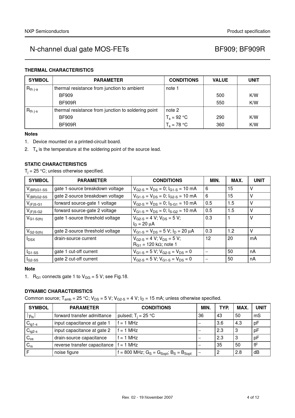 Rth j-a thermal resistance from junction to ambient note 1 BF909 500 K/W BF909R 550 K/W Rth j-s thermal resistance from junction to soldering point note 2 BF909 Ts = 92 °C 290 K/W BF909R Ts = 78 °C 360 K/W