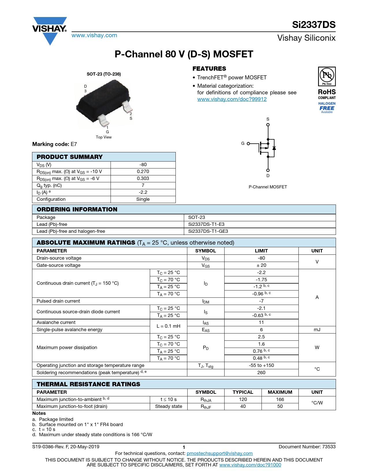Si2337DS. P-Channel 80 V (D-S) MOSFET. FEATURES. SOT-23 (TO-236). Marking code:. PRODUCT SUMMARY. ORDERING INFORMATION
