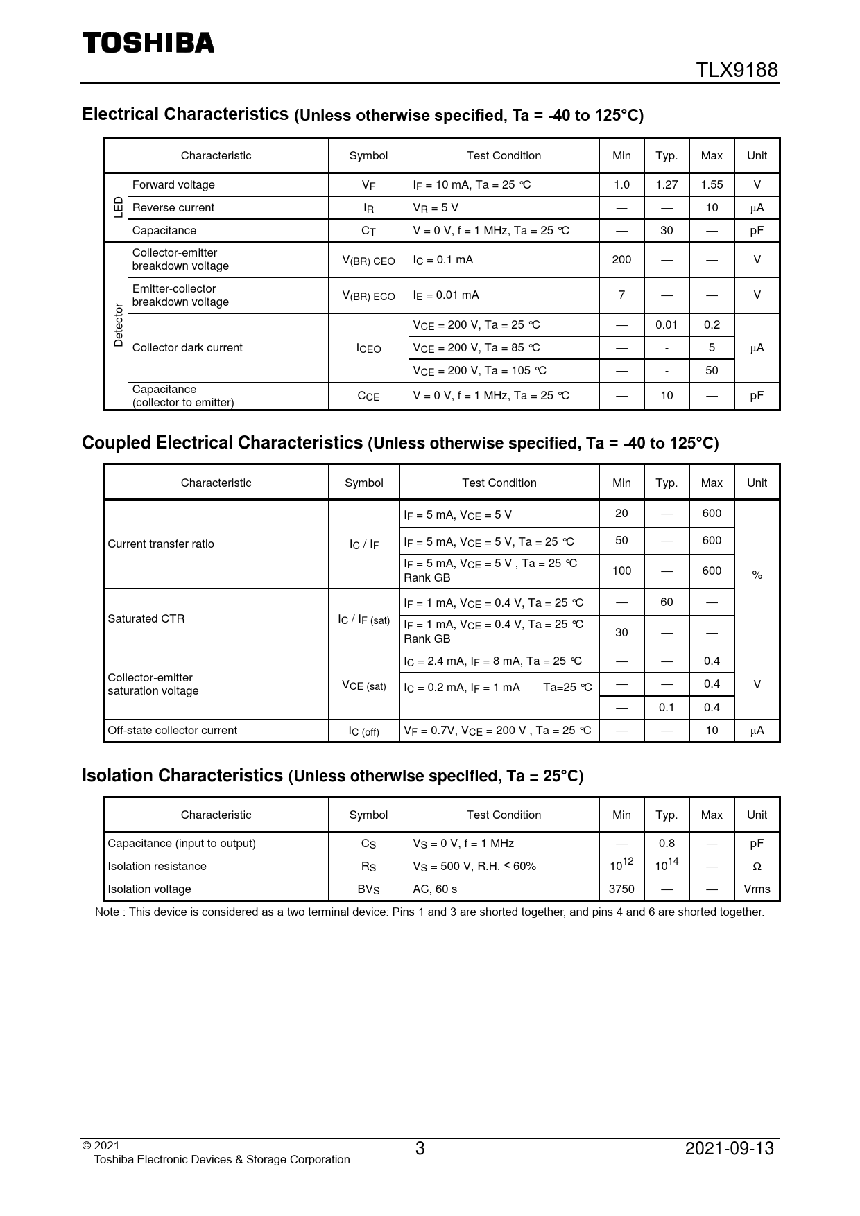 Characteristic Symbol Test Condition Min Typ. Max Unit Forward voltage VF IF = 10 mA, Ta = 25 °C 1.0 1.27 1.55 V D E Reverse current I L R VR = 5 V ― — 10 μA Capacitance CT V = 0 V, f = 1 MHz, Ta = 25 °C — 30 — pF Collector-emitter V breakdown voltage (BR) CEO IC = 0.1 mA 200 — — V Emitter-collector V(BR) ECO IE = 0.01 mA 7 — — V r breakdown voltage to c te VCE = 200 V, Ta = 25 °C — 0.01 0.2 e D Collector dark current ICEO VCE = 200 V, Ta = 85 °C — - 5 μA VCE = 200 V, Ta = 105 °C — - 50 Capacitance C (collector to emitter) CE V = 0 V, f = 1 MHz, Ta = 25 °C — 10 — pF