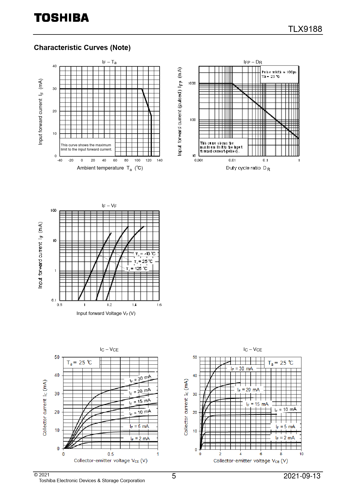 01_I -Ta F IF – Ta IFP – DR 40 (mA) 30 F It en rr 20 cu ward 10 ut for Inp This curve shows the maximum limit to the input forward current. 0 -40 -20 0 20 40 60 80 100 120 140 Ambient temperature Ta (℃) IF – VF Input forward Voltage VF (V) IC – VCE IC – VCE © 2 021 5 2021-09-13 Toshiba Electronic Devices & Storage Corporation