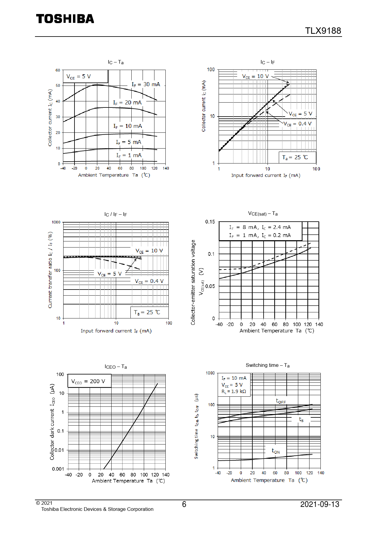 TLX9188. IC. –. Ta. IC. –. IF. IC. /. IF. –. IF. VCE(sat). –. Ta. Switching. time. –. T. I. a. CEO. –. Ta. ©. 2. 021. 6. 2021-09-13. Toshiba. Electronic. Devices. &. Storage