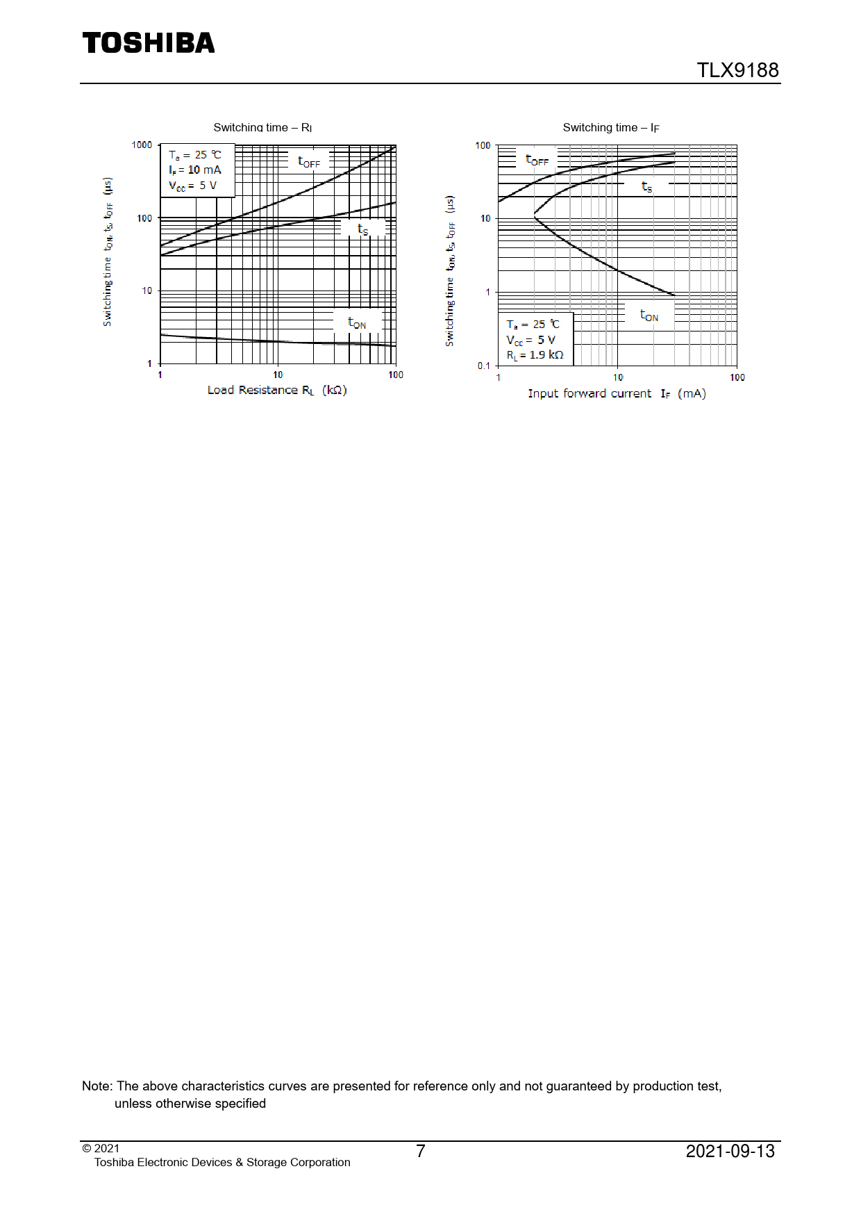 TLX9188 Switching time – RL Switching time – IF IC / IF – IF VCE(sat) – Ta ICEO – Ta Note: The above characteristics curves are presented for reference only and not guaranteed by production test, unless otherwise specified © 2 021 7 2021-09-13 Toshiba Electronic Devices & Storage Corporation