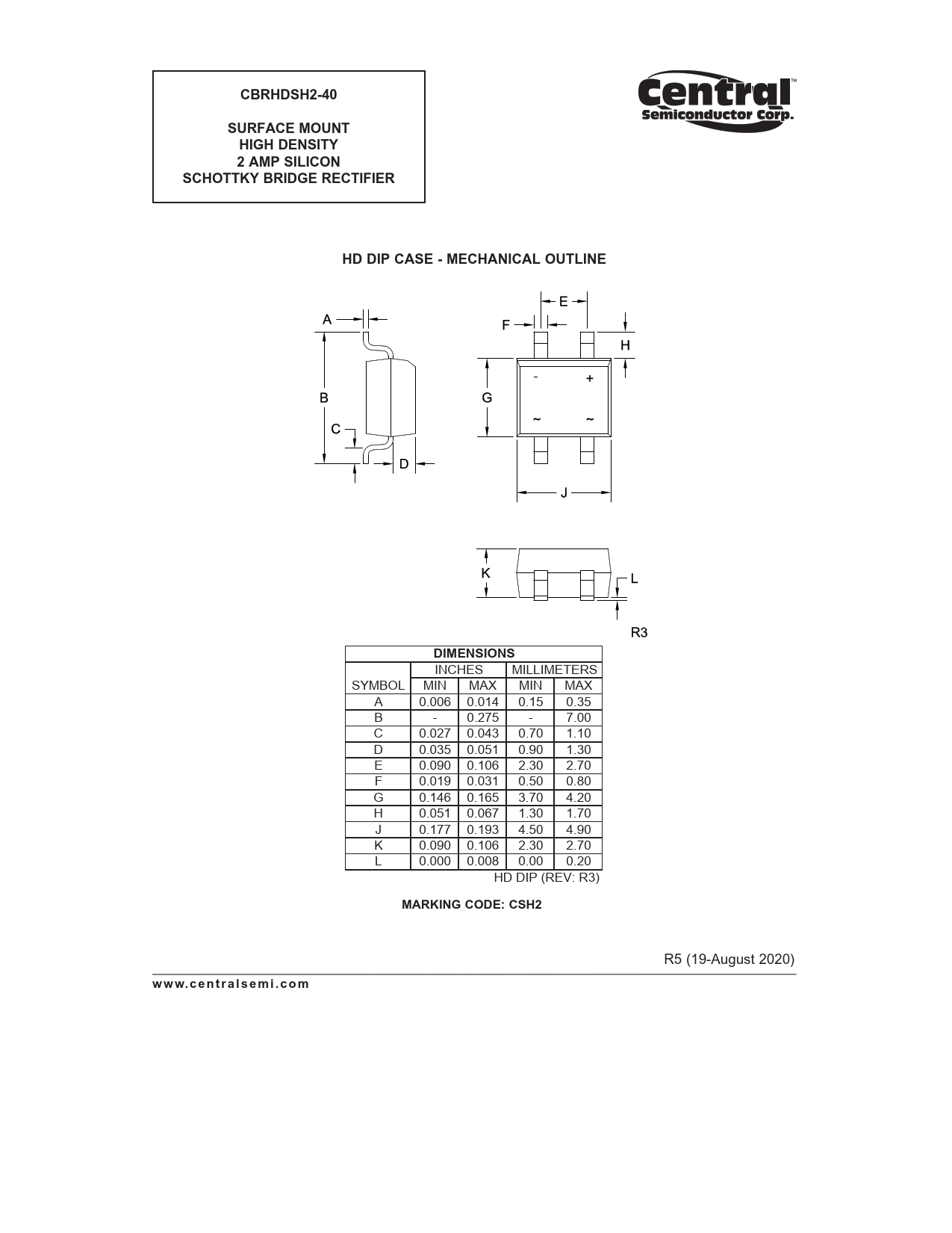 CBRHDSH2-40. SURFACE MOUNT. HIGH DENSITY. 2 AMP SILICON. SCHOTTKY BRIDGE RECTIFIER. HD DIP CASE - MECHANICAL OUTLINE. DIMENSIONS