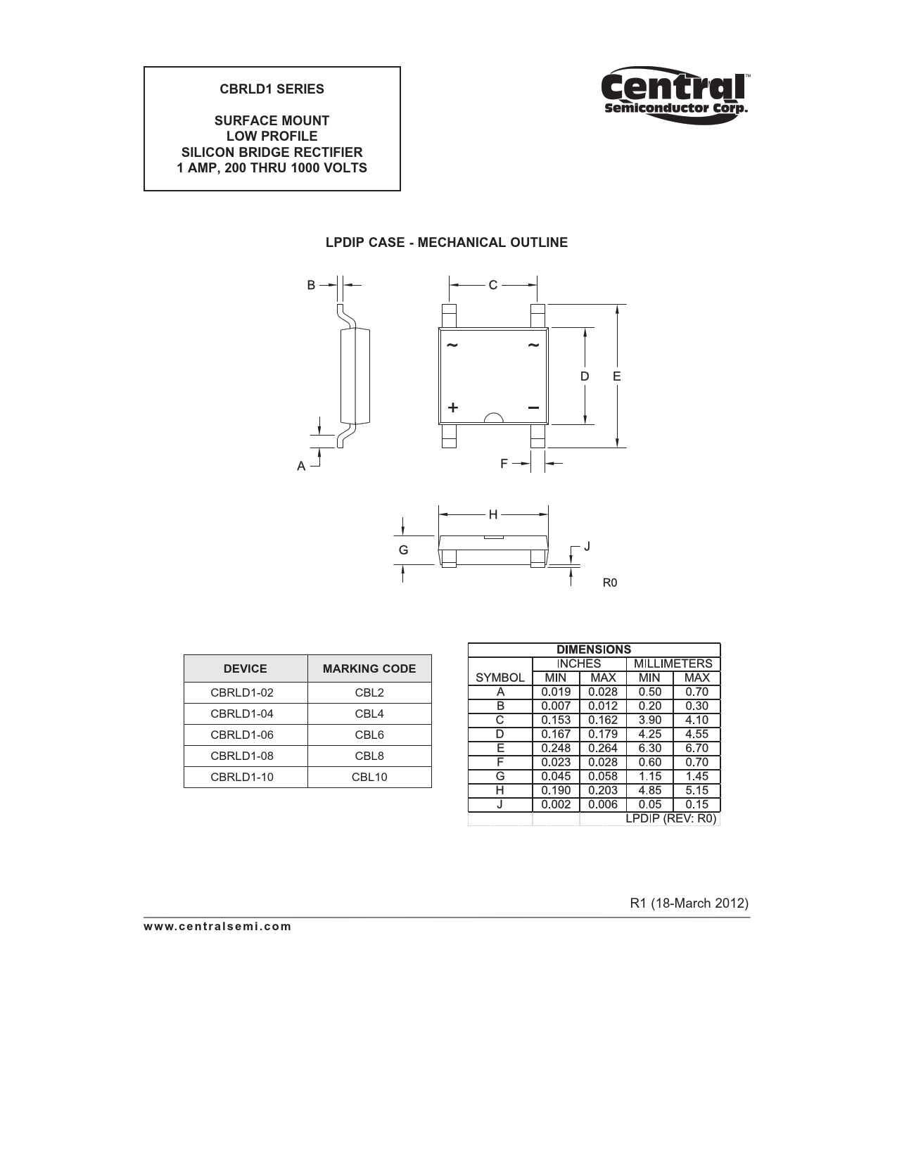 CBRLD1 SERIESSURFACE MOUNTLOW PROFILESILICON BRIDGE RECTIFIER1 AMP, 200 THRU 1000 VOLTSLPDIP CASE - MECHANICAL OUTLINEDEVICEMARKING CODE CBRLD1-02 CBL2 CBRLD1-04 CBL4 CBRLD1-06 CBL6 CBRLD1-08 CBL8 CBRLD1-10 CBL10 R1 (18-March 2012) w w w. c e n t r a l s e m i . c o m