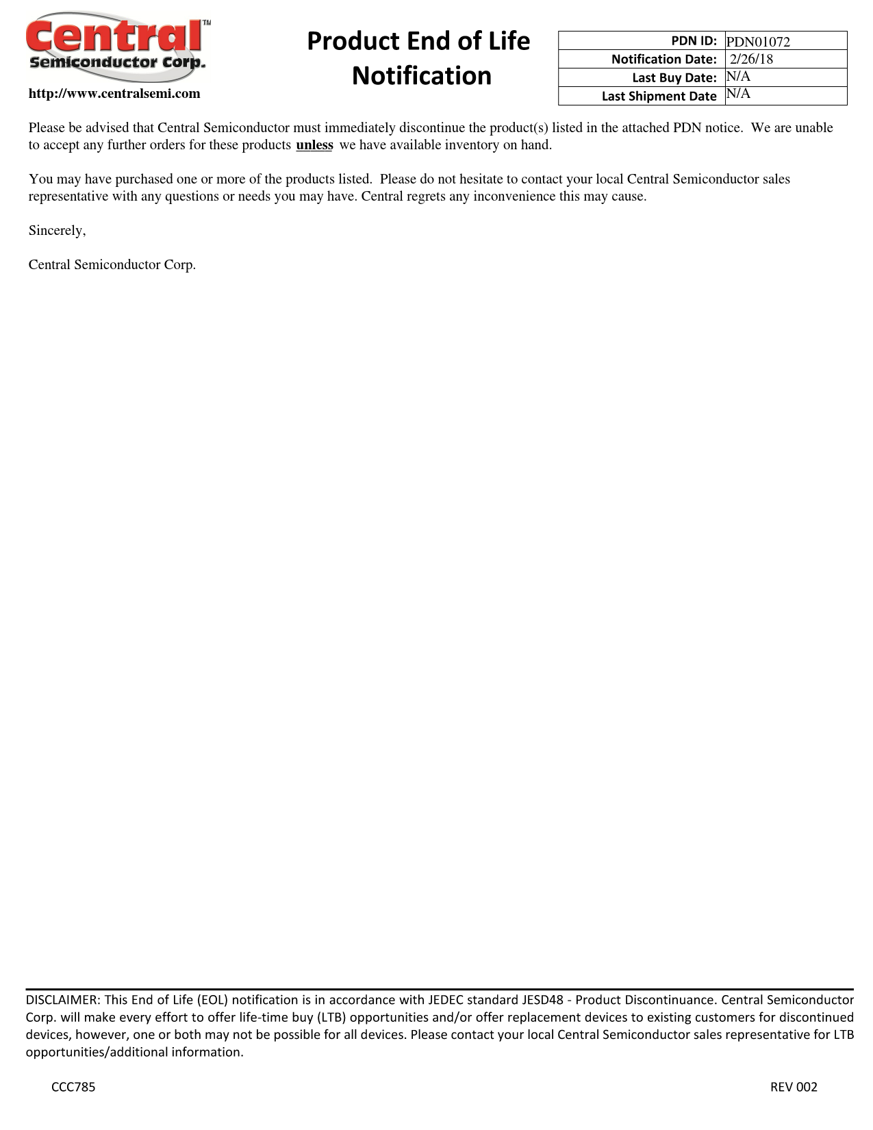 N/A Please be advised that Central Semiconductor must immediately discontinue the product(s) listed in the attached PDN notice. We are unable to accept any further orders for these products