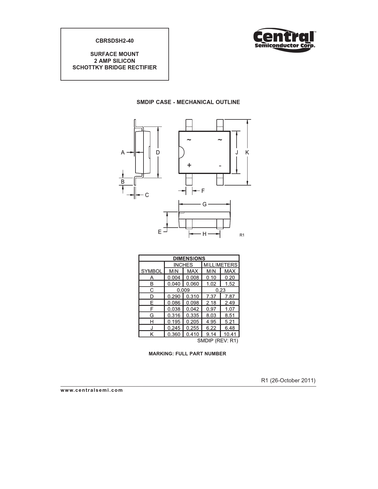 Model Line for this Datasheet Text Version of Document CBRSDSH2-40 SURFACE MOUNT 2 AMP SILICON SCHOTTKY BRIDGE RECTIFIER SMDIP CASE - MECHANICAL OUTLINE MARKING: FULL PART NUMBER R1 (26-October 2011)www.centralsemi.com