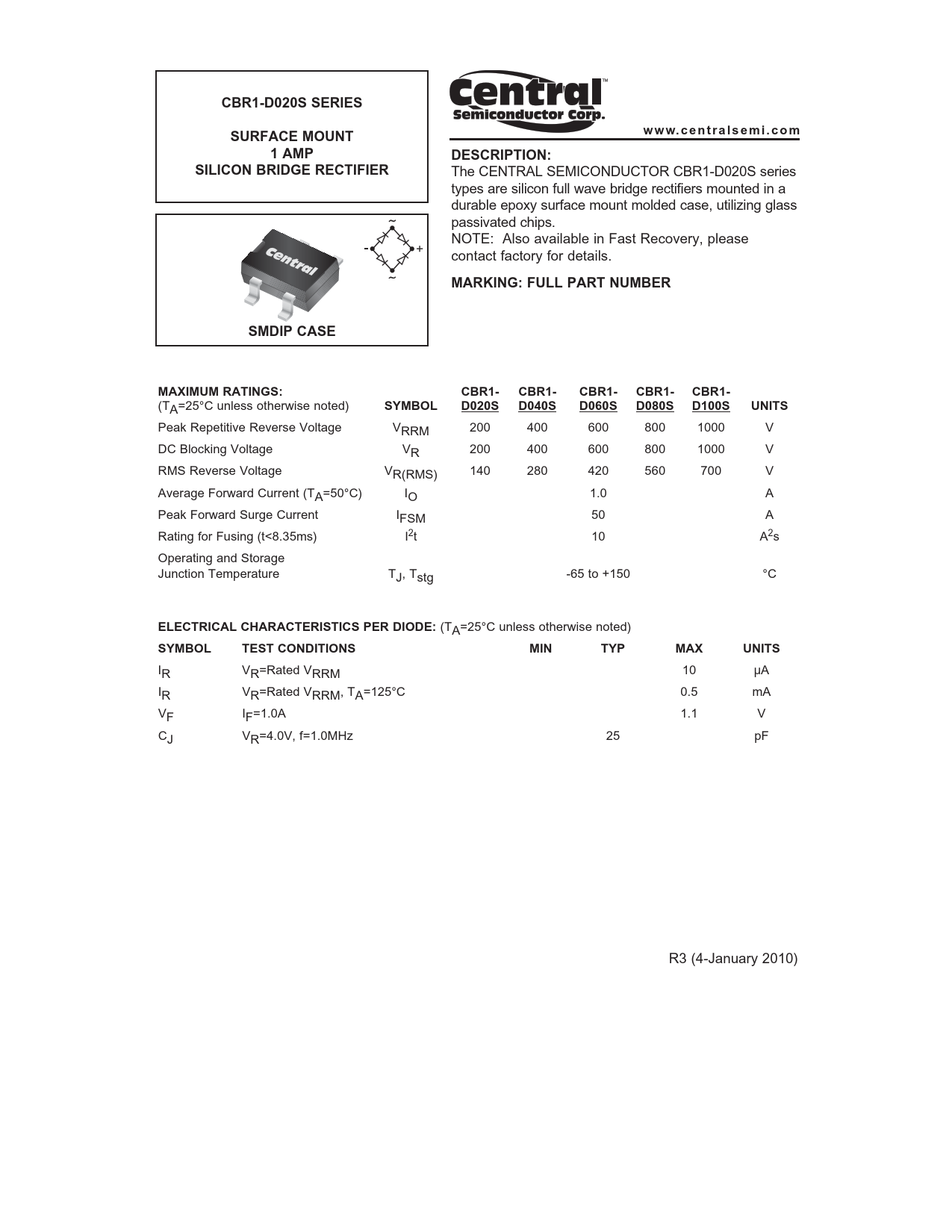 CBR1-D020S SERIESSURFACE MOUNTwww.centra lsemi.com1 AMPDESCRIPTION:SILICON BRIDGE RECTIFIER The CENTRAL SEMICONDUCTOR CBR1-D020S series types are silicon full wave bridge rectifiers mounted in a durable epoxy surface mount molded case, utilizing glass passivated chips. NOTE: Also available in Fast Recovery, please contact factory for details. MARKING: FULL PART NUMBERSMDIP CASEMAXIMUM RATINGS:CBR1- CBR1-CBR1- CBR1- CBR1- (TA=25°C unless otherwise noted) SYMBOL D020S D040S D060S D080S D100S UNITS Peak Repetitive Reverse Voltage VRRM 200 400 600 800 1000 V DC Blocking Voltage VR 200 400 600 800 1000 V RMS Reverse Voltage VR(RMS) 140 280 420 560 700 V Average Forward Current (TA=50°C) IO 1.0 A Peak Forward Surge Current IFSM 50 A Rating for Fusing (t<8.35ms) I2t 10 A2s Operating and Storage Junction Temperature TJ, Tstg -65 to +150 °C ELECTRICAL CHARACTERISTICS PER DIODE: (TA=25°C unless otherwise noted) SYMBOLTEST CONDITIONSMINTYP MAXUNITS IR VR=Rated VRRM 10 µA IR VR=Rated VRRM, TA=125°C 0.5 mA VF IF=1.0A 1.1 V CJ VR=4.0V, f=1.0MHz 25 pF R3 (4-January 2010)