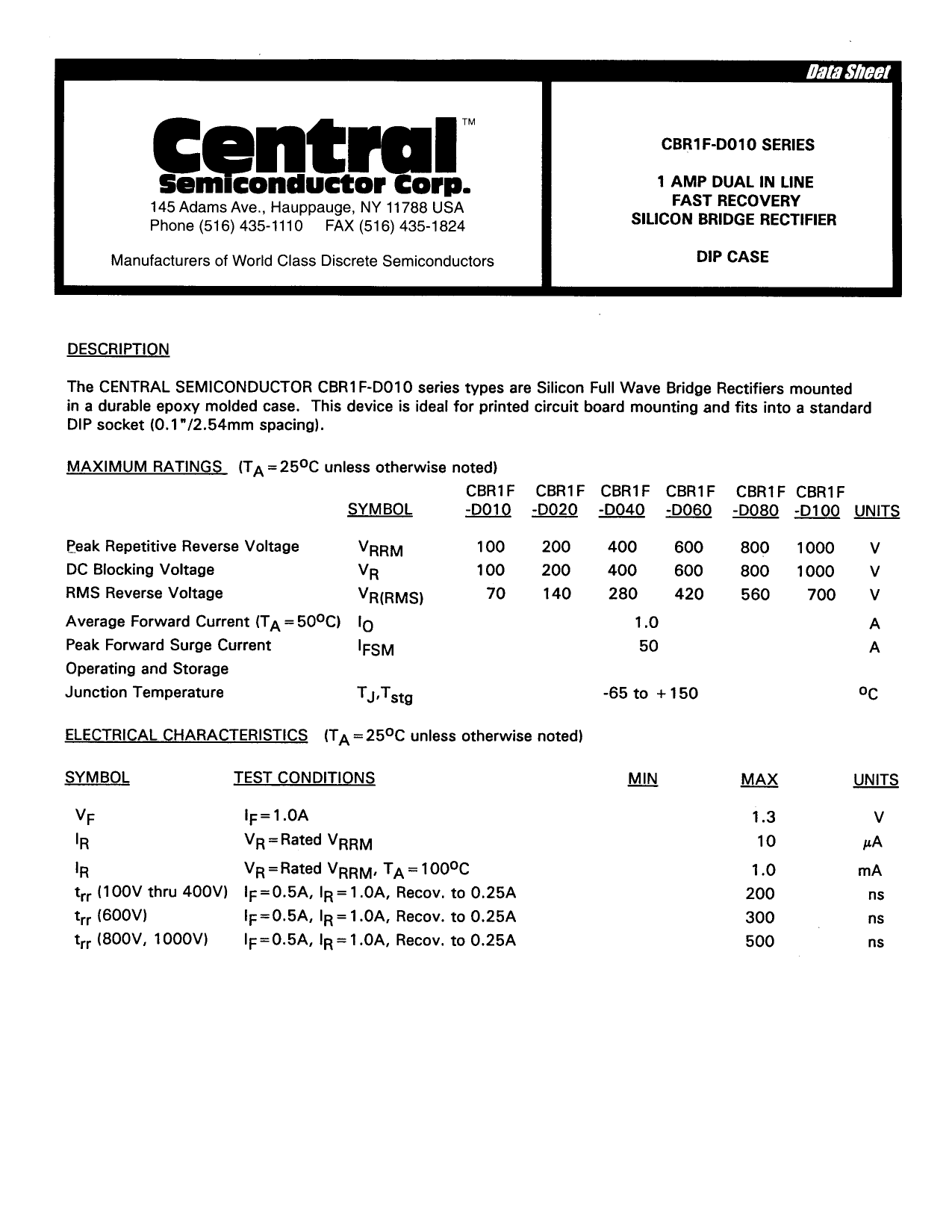 Datasheet CBR1F-D010 (Central Semiconductor)
