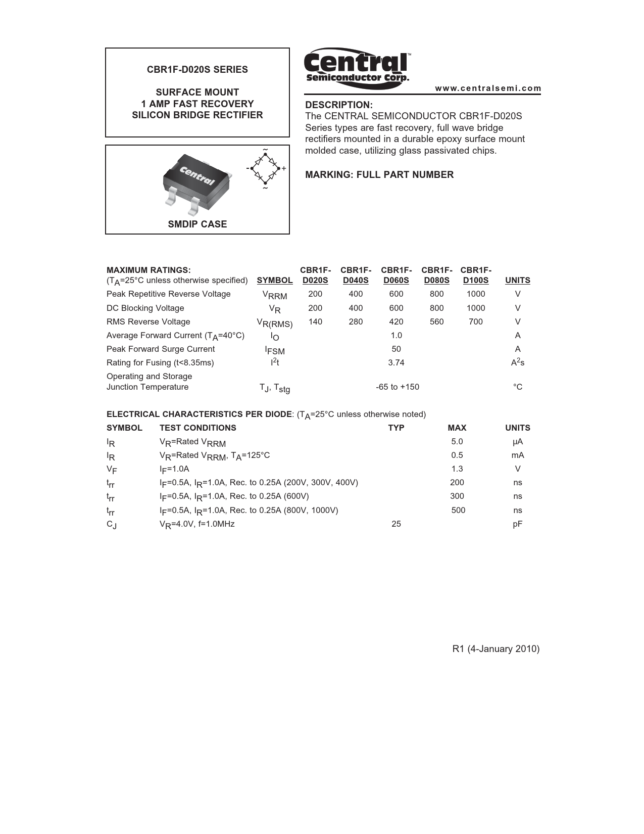 CBR1F-D020S SERIESSURFACE MOUNTwww.centra lsemi.com1 AMP FAST RECOVERYDESCRIPTION:SILICON BRIDGE RECTIFIER The CENTRAL SEMICONDUCTOR CBR1F-D020S Series types are fast recovery, full wave bridge rectifiers mounted in a durable epoxy surface mount molded case, utilizing glass passivated chips. MARKING: FULL PART NUMBERSMDIP CASEMAXIMUM RATINGS:CBR1F- CBR1F- CBR1F- CBR1F- CBR1F- (TA=25°C unless otherwise specified) SYMBOL D020S D040S D060S D080S D100S UNITS Peak Repetitive Reverse Voltage VRRM 200 400 600 800 1000 V DC Blocking Voltage VR 200 400 600 800 1000 V RMS Reverse Voltage VR(RMS) 140 280 420 560 700 V Average Forward Current (TA=40°C) IO 1.0 A Peak Forward Surge Current IFSM 50 A Rating for Fusing (t<8.35ms) I2t 3.74 A2s Operating and Storage Junction Temperature TJ, Tstg -65 to +150 °C ELECTRICAL CHARACTERISTICS PER DIODE : (TA=25°C unless otherwise noted) SYMBOL TESTCONDITIONSTYPMAXUNITS IR VR=Rated VRRM 5.0 µA IR VR=Rated VRRM, TA=125°C 0.5 mA VF IF=1.0A 1.3 V trr IF=0.5A, IR=1.0A, Rec. to 0.25A (200V, 300V, 400V) 200 ns trr IF=0.5A, IR=1.0A, Rec. to 0.25A (600V) 300 ns trr IF=0.5A, IR=1.0A, Rec. to 0.25A (800V, 1000V) 500 ns CJ VR=4.0V, f=1.0MHz 25 pF R1 (4-January 2010)