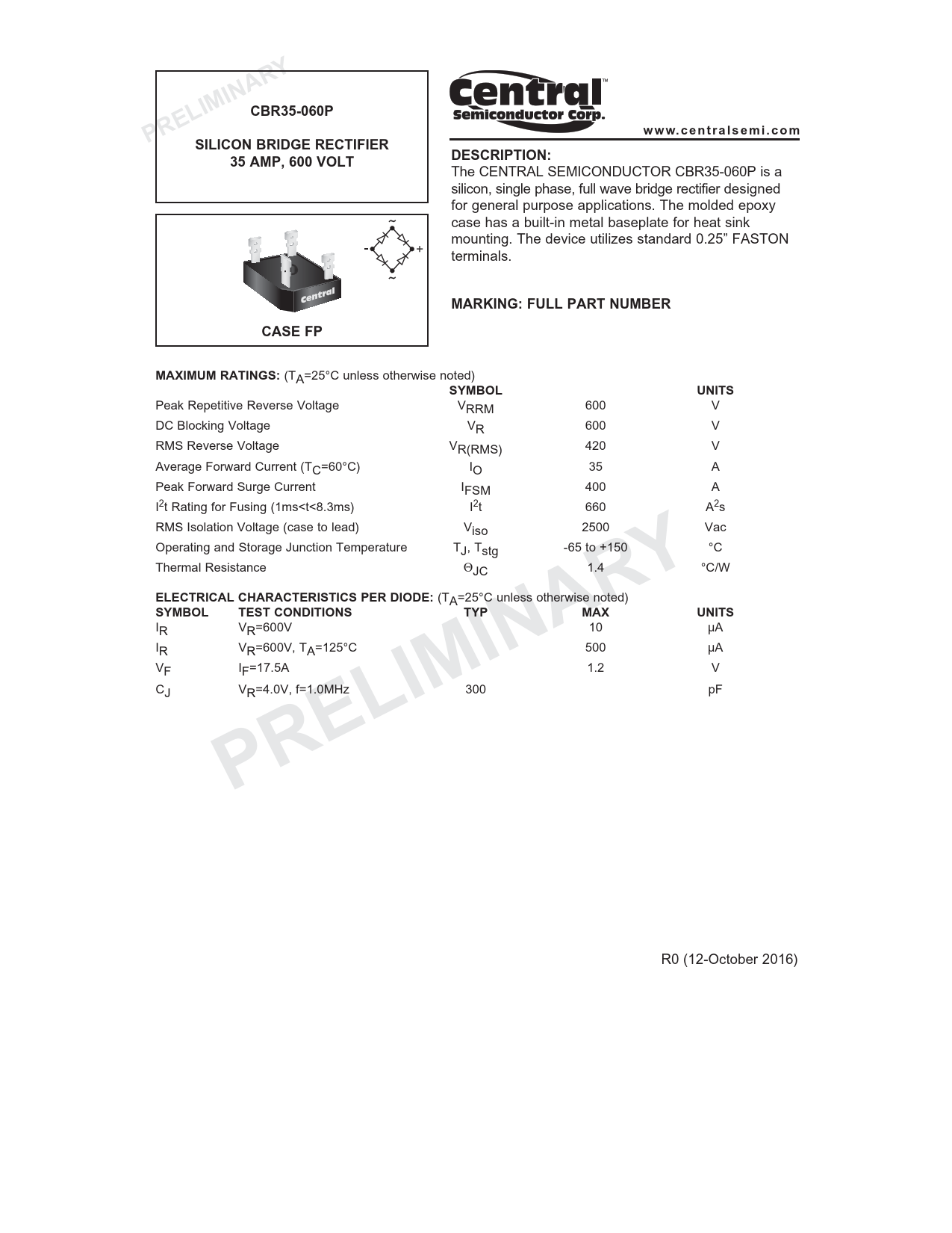CBR35-060P. PRELIMINAR. www.centra lsemi.com. SILICON BRIDGE RECTIFIER. 35 AMP, 600 VOLT. DESCRIPTION:. MARKING: FULL PART NUMBER