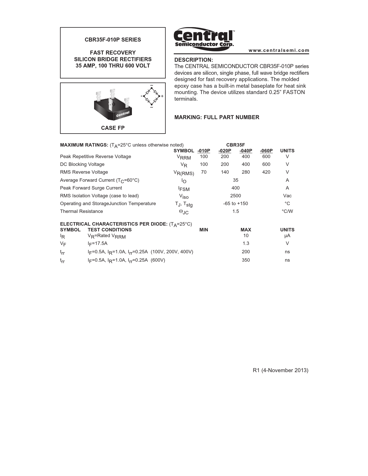 CBR35F-010P SERIES. FAST RECOVERY. w w w. c e n t r a l s e m i . c o m. SILICON BRIDGE RECTIFIERS. DESCRIPTION: