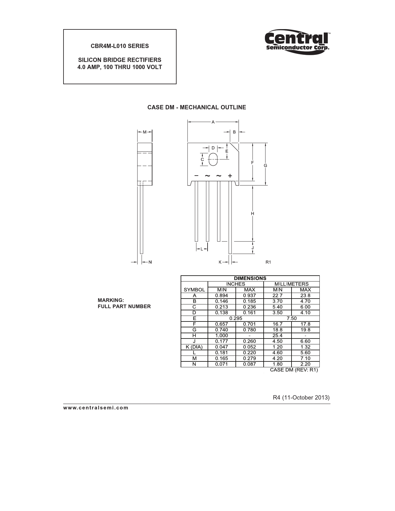 CBR4M-L010 SERIES. SILICON BRIDGE RECTIFIERS. 4.0 AMP, 100 THRU 1000 VOLT. CASE DM - MECHANICAL OUTLINE