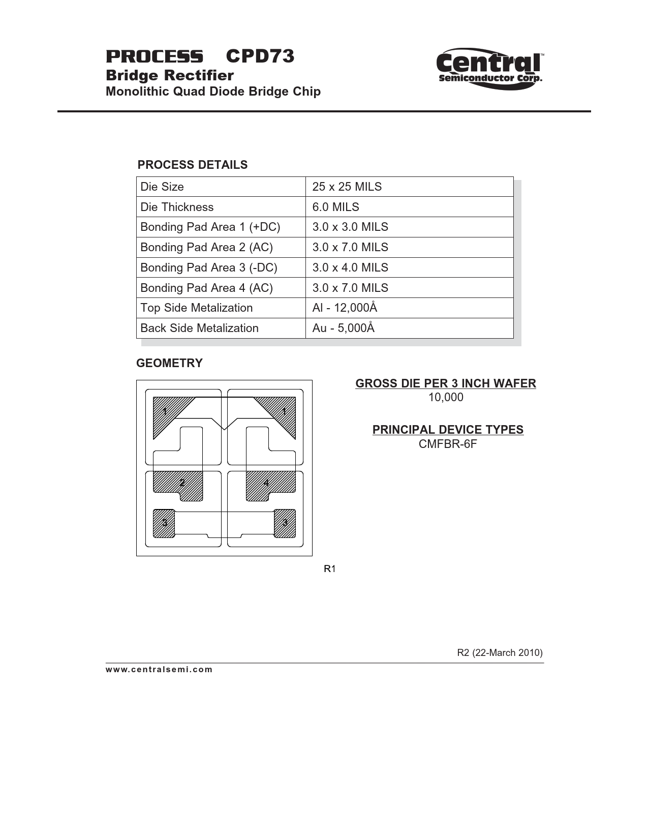 PROCESS. Monolithic Quad Diode Bridge Chip. PROCESS DETAILS. GEOMETRY. GROSS DIE PER 3 INCH WAFER. PRINCIPAL DEVICE TYPES