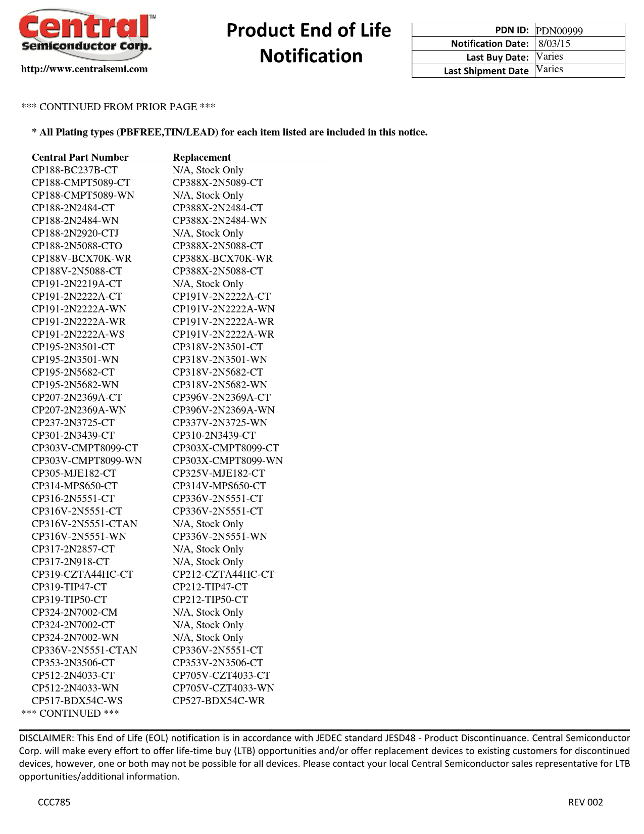 http://www.centralsemi.com. * All Plating types (PBFREE,TIN/LEAD) for each item listed are included in this notice