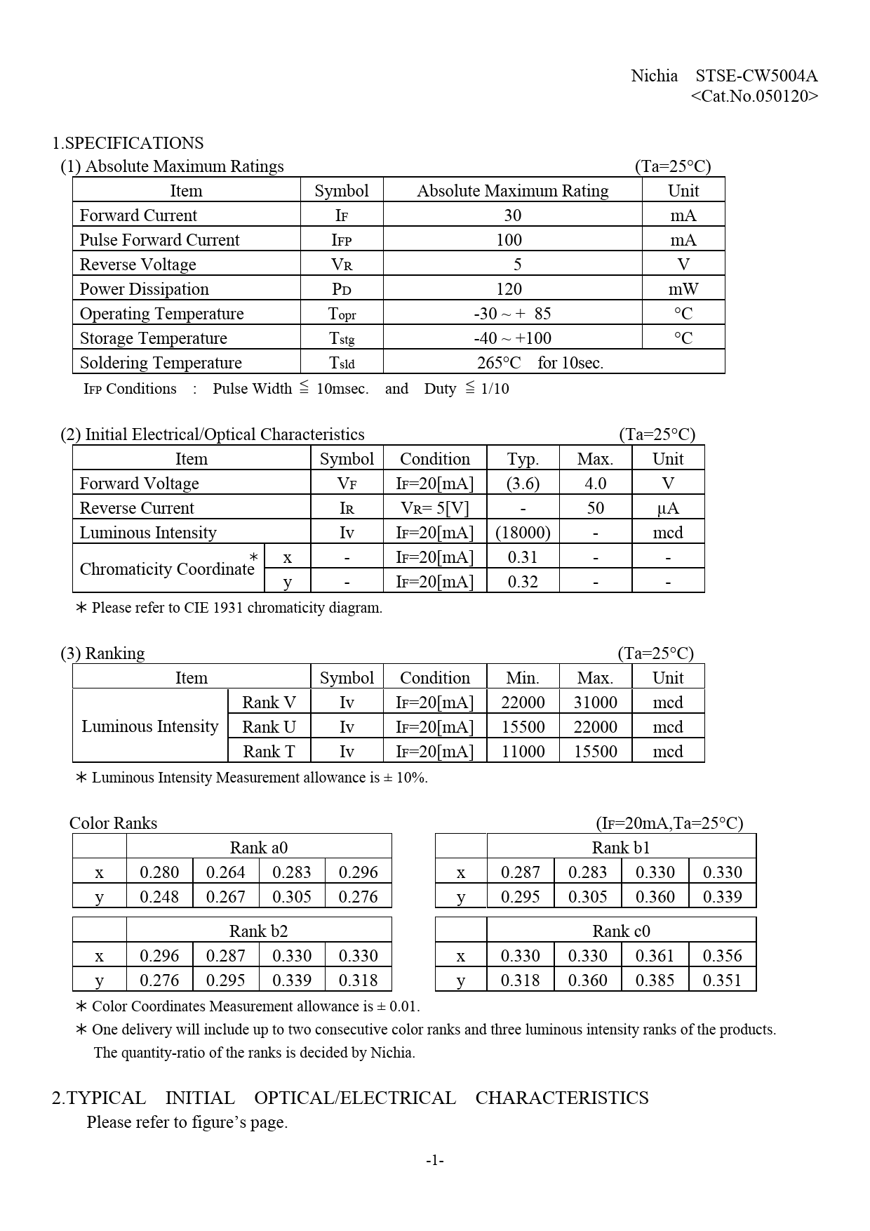 Nichia. STSE-CW5004A. <Cat.No.050120>. 1.SPECIFICATIONS. (1). Absolute. Maximum. Ratings. (Ta=25°C). Item. Symbol. Absolute. Maximum