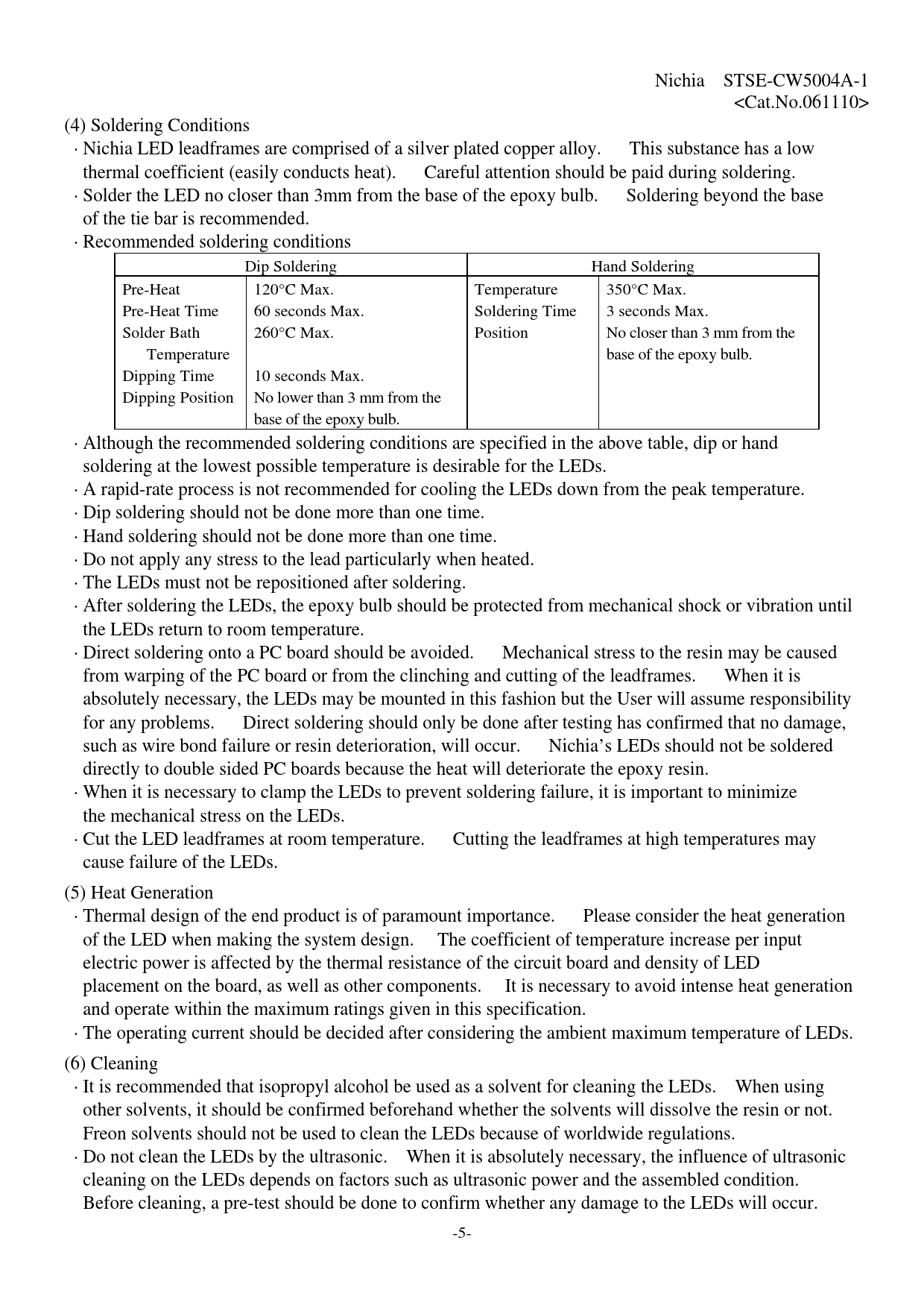 Nichia STSE-CW5004A-1 <Cat.No.061110> (4) Soldering Conditions · Nichia LED leadframes are comprised of a silver plated copper alloy. This substance has a low thermal coefficient (easily conducts heat). Careful attention should be paid during soldering. · Solder the LED no closer than 3mm from the base of the epoxy bulb. Soldering beyond the base of the tie bar is recommended. · Recommended soldering conditions Dip Soldering Hand Soldering Pre-Heat 120°C Max. Temperature 350°C Max. Pre-Heat Time 60 seconds Max. Soldering Time 3 seconds Max. Solder Bath 260°C Max. Position No closer than 3 mm from the Temperature base of the epoxy bulb. Dipping Time 10 seconds Max. Dipping Position No lower than 3 mm from the base of the epoxy bulb. · Although the recommended soldering conditions are specified in the above table, dip or hand soldering at the lowest possible temperature is desirable for the LEDs. · A rapid-rate process is not recommended for cooling the LEDs down from the peak temperature. · Dip soldering should not be done more than one time. · Hand soldering should not be done more than one time. · Do not apply any stress to the lead particularly when heated. · The LEDs must not be repositioned after soldering. · After soldering the LEDs, the epoxy bulb should be protected from mechanical shock or vibration until the LEDs return to room temperature. · Direct soldering onto a PC board should be avoided. Mechanical stress to the resin may be caused from warping of the PC board or from the clinching and cutting of the leadframes. When it is absolutely necessary, the LEDs may be mounted in this fashion but the User will assume responsibility for any problems. Direct soldering should only be done after testing has confirmed that no damage, such as wire bond failure or resin deterioration, will occur. Nichia’s LEDs should not be soldered directly to double sided PC boards because the heat will deteriorate the epoxy resin. · When it is necessary to clamp the LEDs to prevent soldering failure, it is important to minimize the mechanical stress on the LEDs. · Cut the LED leadframes at room temperature. Cutting the leadframes at high temperatures may cause failure of the LEDs. (5) Heat Generation · Thermal design of the end product is of paramount importance. Please consider the heat generation of the LED when making the system design. The coefficient of temperature increase per input electric power is affected by the thermal resistance of the circuit board and density of LED placement on the board, as well as other components. It is necessary to avoid intense heat generation and operate within the maximum ratings given in this specification. · The operating current should be decided after considering the ambient maximum temperature of LEDs. (6) Cleaning · It is recommended that isopropyl alcohol be used as a solvent for cleaning the LEDs. When using other solvents, it should be confirmed beforehand whether the solvents will dissolve the resin or not. Freon solvents should not be used to clean the LEDs because of worldwide regulations. · Do not clean the LEDs by the ultrasonic. When it is absolutely necessary, the influence of ultrasonic cleaning on the LEDs depends on factors such as ultrasonic power and the assembled condition. Before cleaning, a pre-test should be done to confirm whether any damage to the LEDs will occur. -5-