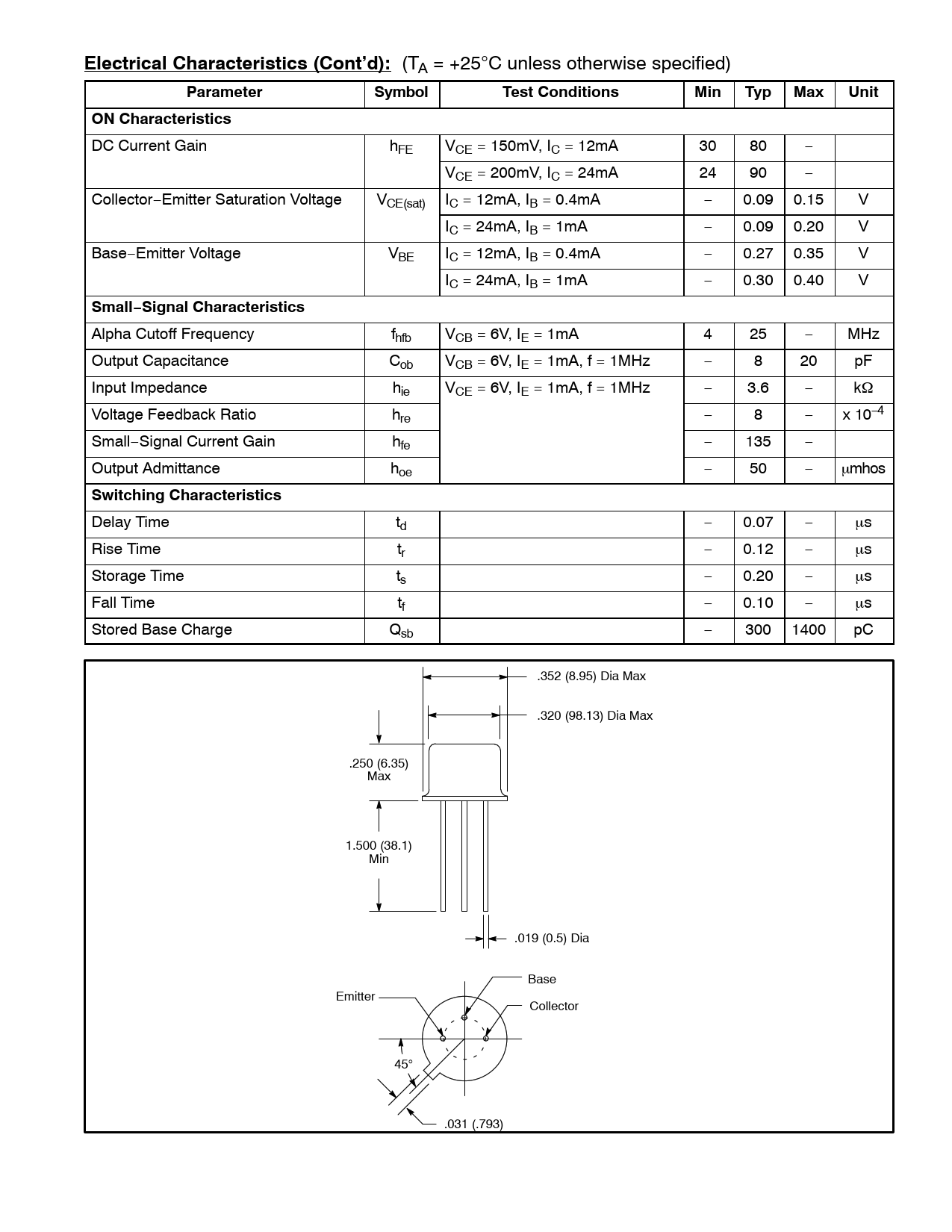 Delay Time td − 0.07 − s Rise Time tr − 0.12 − s Storage Time ts − 0.20 − s Fall Time tf − 0.10 − s Stored Base Charge Qsb − 300 1400 pC .352 (8.95) Dia Max .320 (98.13) Dia Max .250 (6.35) Max 1.500 (38.1) Min .019 (0.5) Dia Base Emitter Collector 45 .031 (.793)