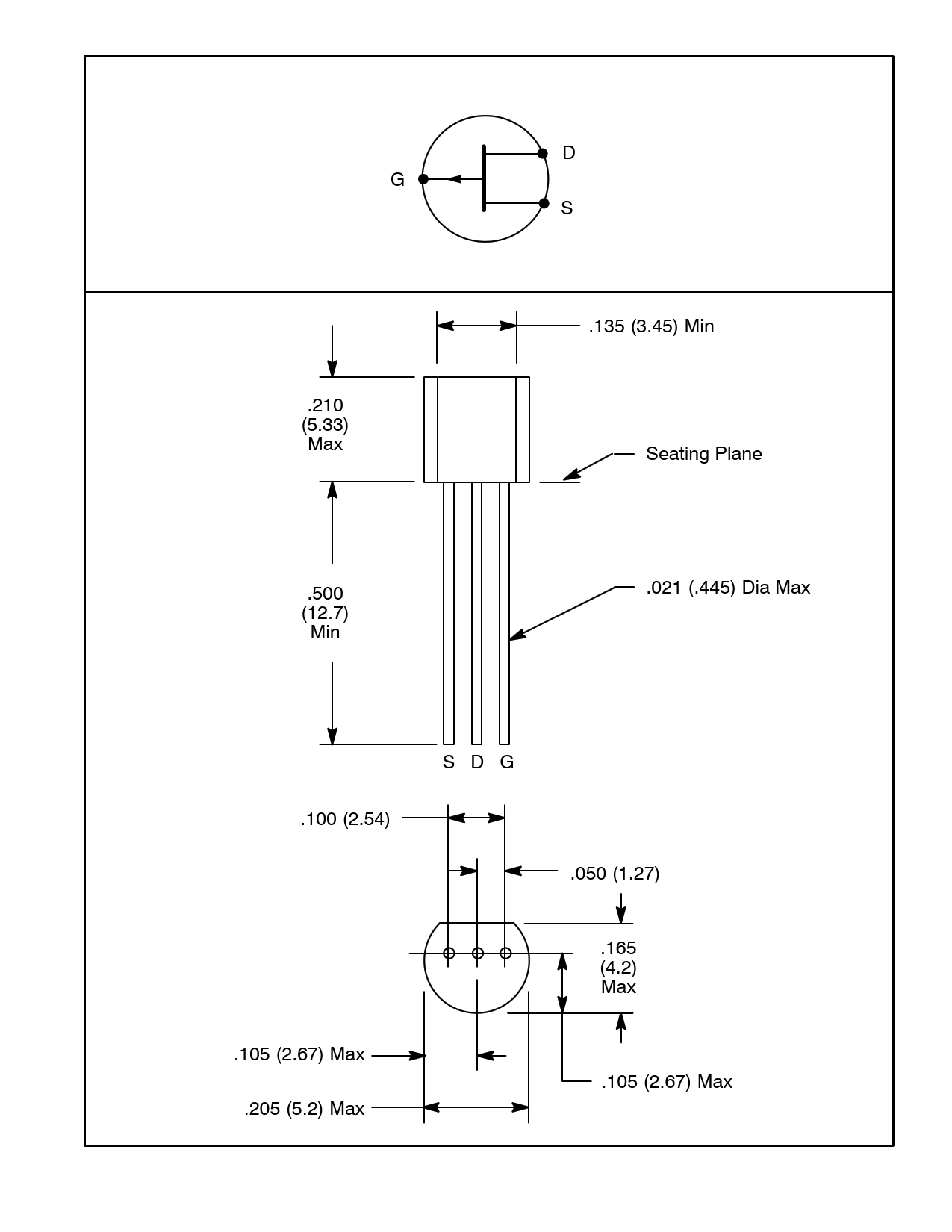 D G S .135 (3.45) Min .210 (5.33) Max Seating Plane .021 (.445) Dia Max .500 (12.7) Min S D G .100 (2.54) .050 (1.27) .165 (4.2) Max .105 (2.67) Max .105 (2.67) Max .205 (5.2) Max