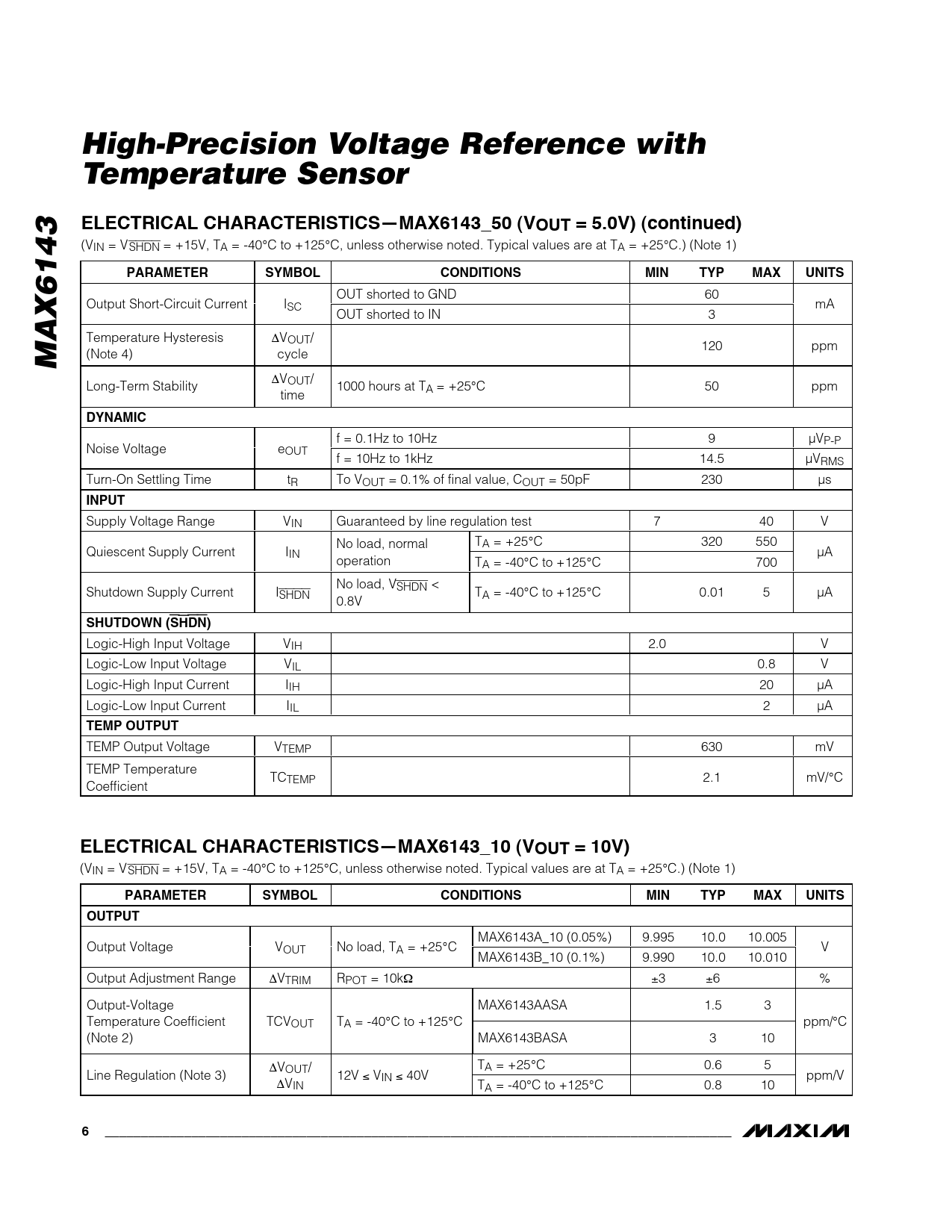 High-Precision Voltage Reference with Temperature Sensor. ELECTRICAL CHARACTERISTICS—MAX6143_50 (VOUT = 5.0V) (continued)
