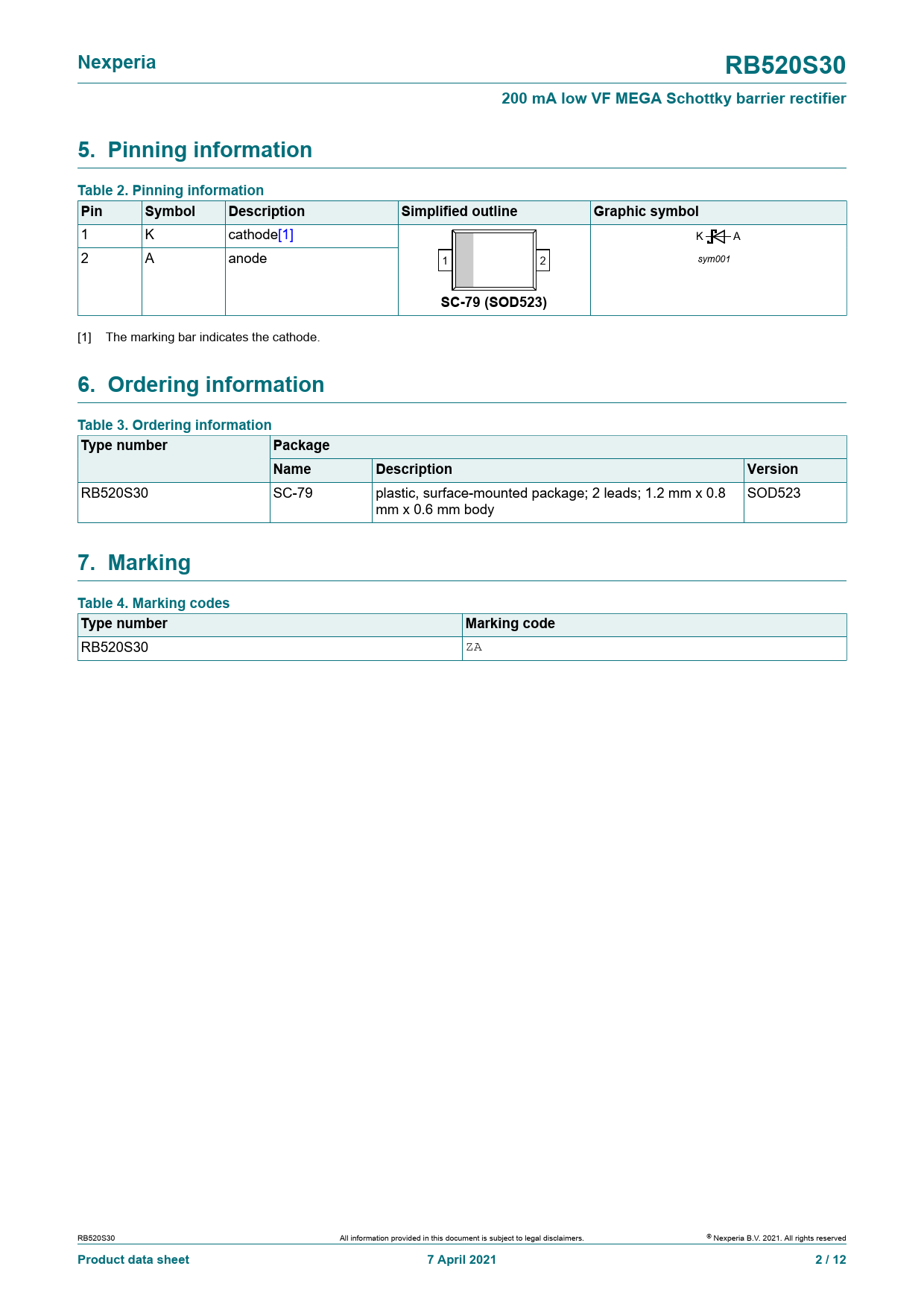 Nexperia. RB520S30. 200 mA low VF MEGA Schottky barrier rectifier. 5. Pinning information Table 2. Pinning information. Pin