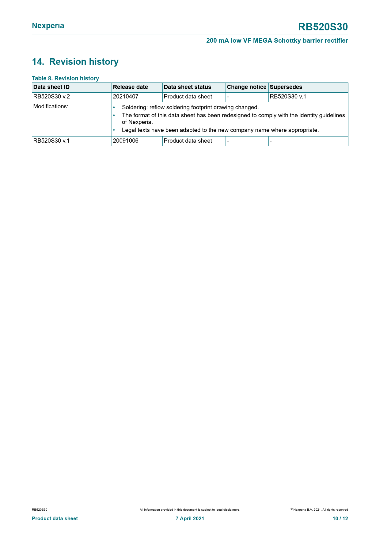 Nexperia. RB520S30. 200 mA low VF MEGA Schottky barrier rectifier. 14. Revision history Table 8. Revision history