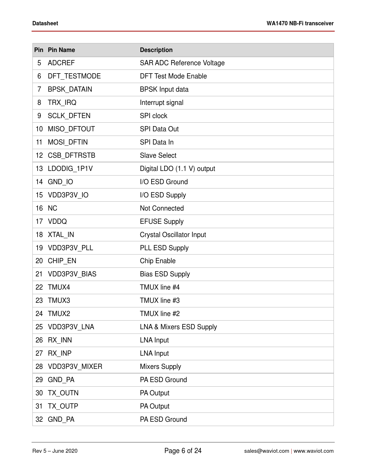 Datasheet WA1470 NB-Fi transceiver Pin Pin Name Description