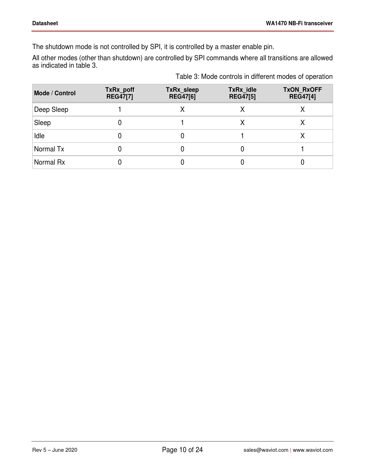 DatasheetWA1470 NB-Fi transceiver The shutdown mode is not controlled by SPI, it is controlled by a master enable pin. All other modes (other than shutdown) are controlled by SPI commands where all transitions are allowed as indicated in table 3. Table 3: Mode controls in different modes of operation TxRx_poffTxRx_sleepTxRx_idleTxON_RxOFFMode / ControlREG47[7]REG47[6]REG47[5]REG47[4] Deep Sleep 1 X X X Sleep 0 1 X X Idle 0 0 1 X Normal Tx 0 0 0 1 Normal Rx 0 0 0 0 Rev 5 – June 2020 Page 10 of 24 sales@waviot.com | www.waviot.com Document Outline Key Product Features General Description Applications Block Diagram & Chip Architecture Pin Diagram Pin List & Description Typical Connectivity Chip Modes Specifications ESD Ratings Operating Range Performance Specifications Description of the Registers eFuse Mirror Registers Non-eFuse Writable Registers Read Only Registers Packaging Information Contact Information