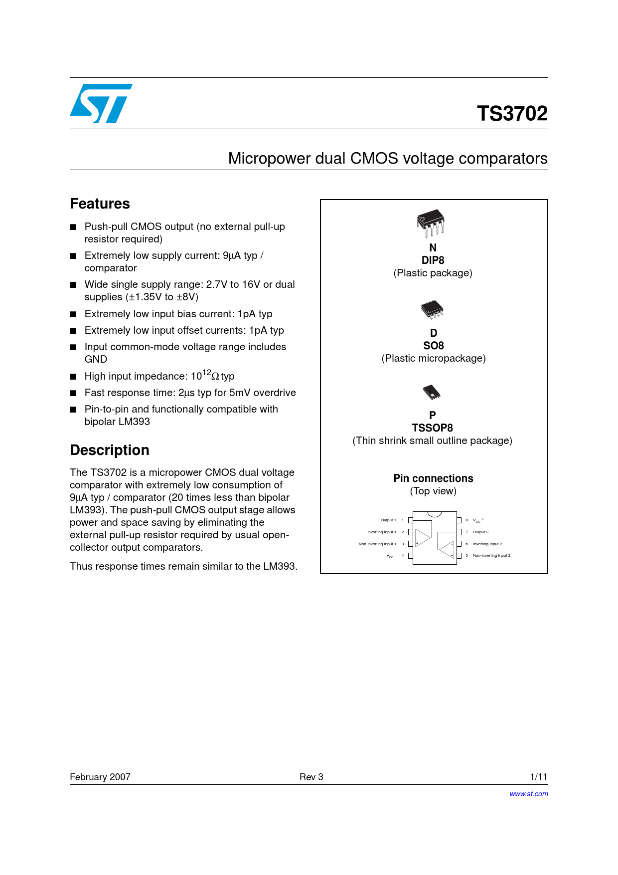 Pages / Page11 / 1 — TS3702. Features. DIP8. SO8. TSSOP8. Description. Pin connections