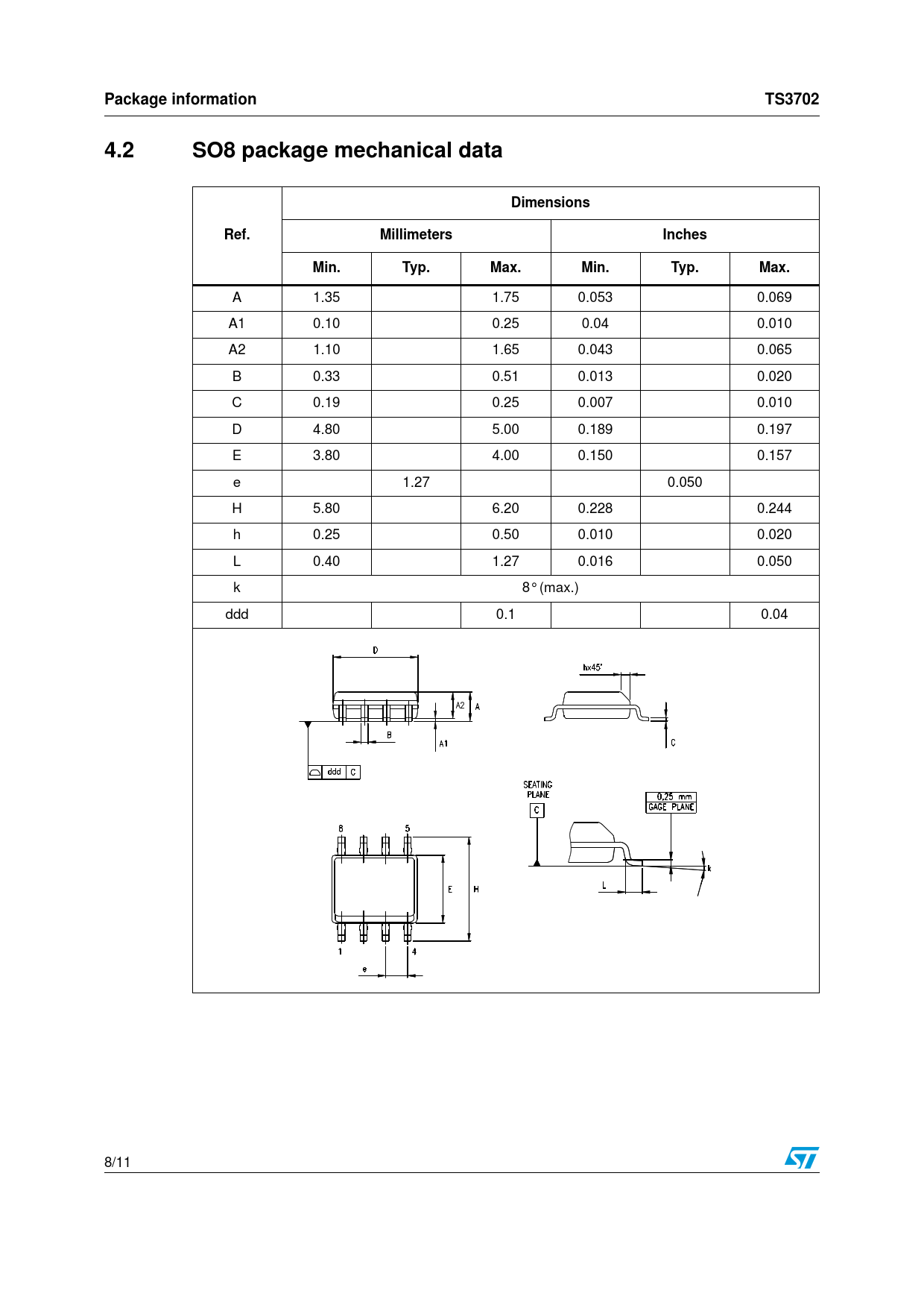 | Pages / Page | 11 / 8 — Package information. TS3702. 4.2. SO8 package mechanical data. … |