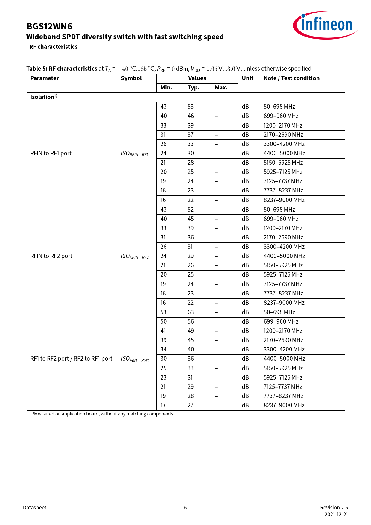 1) 43 53 – dB 50–698 MHz 40 46 – dB 699–960 MHz 33 39 – dB 1200–2170 MHz 31 37 – dB 2170–2690 MHz 26 33 – dB 3300–4200 MHz RFIN to RF1 port ISORFIN−RF1 24 30 – dB 4400–5000 MHz 21 28 – dB 5150–5925 MHz 20 25 – dB 5925–7125 MHz 19 24 – dB 7125–7737 MHz 18 23 – dB 7737–8237 MHz 16 22 – dB 8237–9000 MHz 43 52 – dB 50–698 MHz 40 45 – dB 699–960 MHz 33 39 – dB 1200–2170 MHz 31 36 – dB 2170–2690 MHz 26 31 – dB 3300–4200 MHz RFIN to RF2 port ISORFIN−RF2 24 29 – dB 4400–5000 MHz 21 26 – dB 5150–5925 MHz 20 25 – dB 5925–7125 MHz 19 24 – dB 7125–7737 MHz 18 23 – dB 7737–8237 MHz 16 22 – dB 8237–9000 MHz 53 63 – dB 50–698 MHz 50 56 – dB 699–960 MHz 41 49 – dB 1200–2170 MHz 39 45 – dB 2170–2690 MHz 34 40 – dB 3300–4200 MHz RF1 to RF2 port / RF2 to RF1 port ISOPort−Port 30 36 – dB 4400–5000 MHz 25 33 – dB 5150–5925 MHz 23 31 – dB 5925–7125 MHz 21 29 – dB 7125–7737 MHz 19 28 – dB 7737–8237 MHz 17 27 – dB 8237–9000 MHz 1)Measured on application board, without any matching components. Datasheet 6 Revision 2.5 2021-12-21 Document Outline Titlepage 1 Features 2 Absolute maximum ratings 3 Operation ranges 4 RF characteristics 5 Application information 6 Package information
