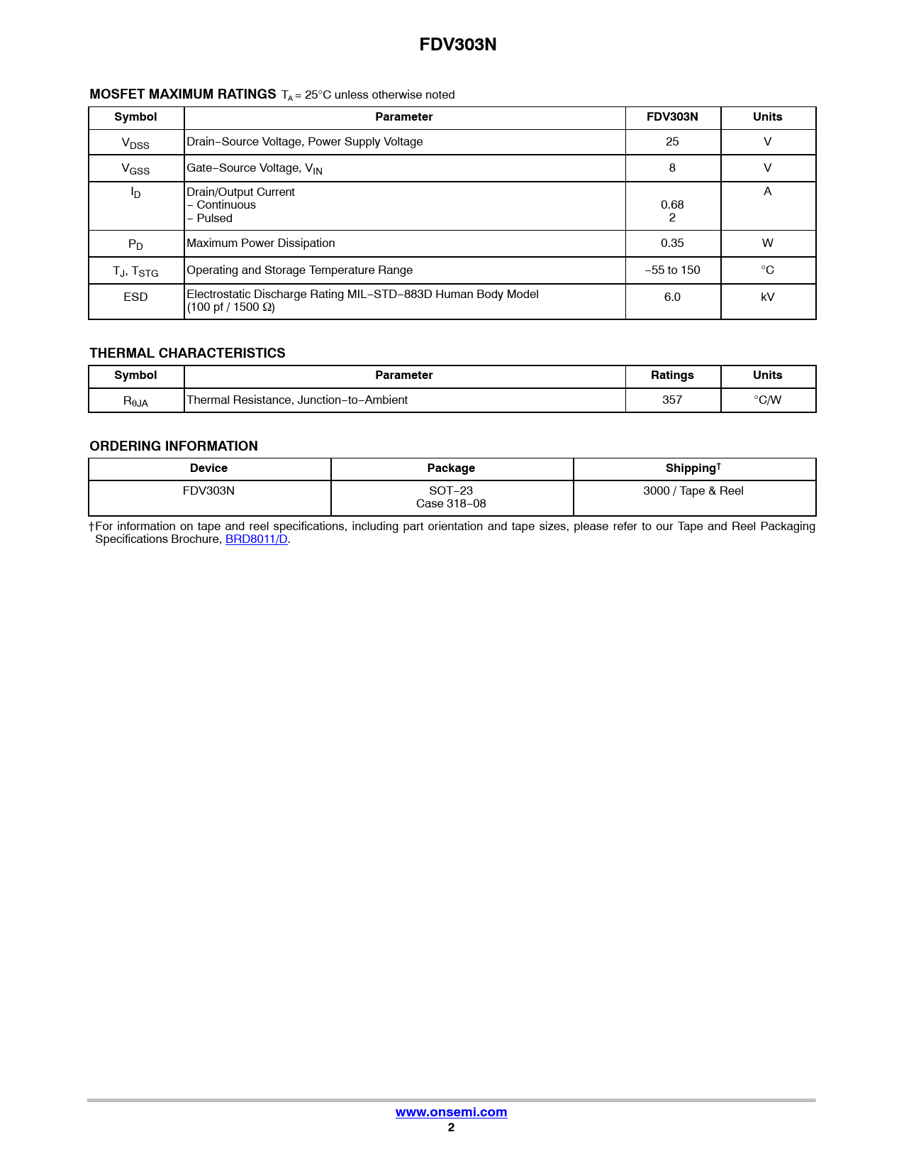 FDV303NMOSFET MAXIMUM RATINGS TA = 25°C unless otherwise noted SymbolParameterFDV303NUnits VDSS Drain−Source Voltage, Power Supply Voltage 25 V VGSS Gate−Source Voltage, VIN 8 V ID Drain/Output Current A − Continuous 0.68 − Pulsed 2 PD Maximum Power Dissipation 0.35 W TJ, TSTG Operating and Storage Temperature Range −55 to 150 °C ESD Electrostatic Discharge Rating MIL−STD−883D Human Body Model 6.0 kV (100 pf / 1500 W) THERMAL CHARACTERISTICSSymbolParameterRatingsUnits RθJA Thermal Resistance, Junction−to−Ambient 357 °C/W ORDERING INFORMATIONDevicePackageShipping† FDV303N SOT−23 3000 / Tape & Reel Case 318−08 †For information on tape and reel specifications, including part orientation and tape sizes, please refer to our Tape and Reel Packaging Specifications Brochure, BRD8011/D. www.onsemi.com2