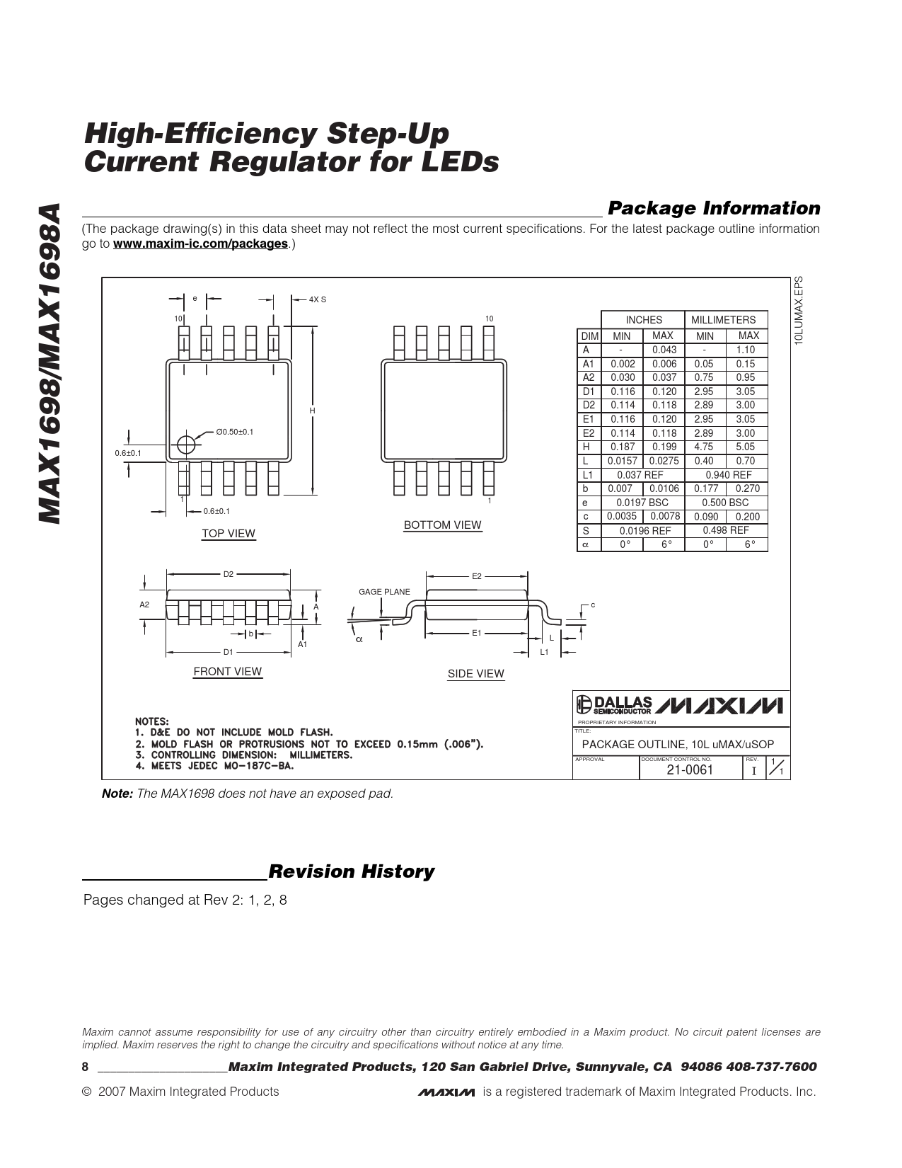 High-Efficiency Step-Up Current Regulator for LEDs. Package Information. www.maxim-ic.com/packages. MAX1698/MAX1698A. Note: