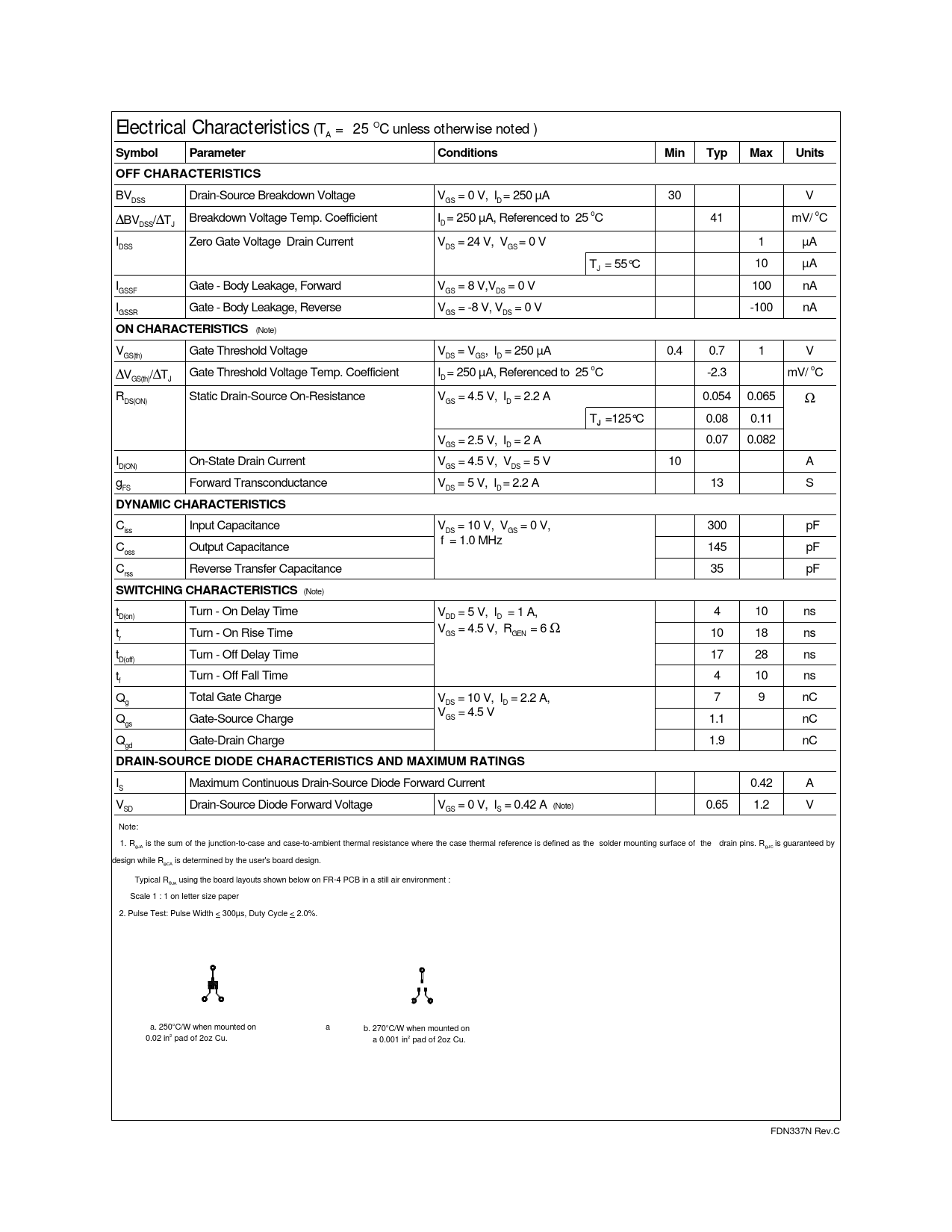 Electrical Characteristics (T = 25 OC unless otherwise noted ) A SymbolParameterConditionsMinTypMaxUnitsOFF CHARACTERISTICS BV Drain-Source Breakdown Voltage V = 0 V, I = 250 µA 30 V DSS GS D ∆BV /∆T Breakdown Voltage Temp. Coefficient I = 250 µA, Referenced to 25 oC 41 mV/ oC DSS J D I Zero Gate Voltage Drain Current V = 24 V, V = 0 V 1 µA DSS DS GS T = 55°C 10 µA J I Gate - Body Leakage, Forward V = 8 V,V = 0 V 100 nA GSSF GS DS I Gate - Body Leakage, Reverse V = -8 V, V = 0 V -100 nA GSSR GS DS ON CHARACTERISTICS (Note) V Gate Threshold Voltage V = V , I = 250 µA 0.4 0.7 1 V GS(th) DS GS D ∆V /∆T Gate Threshold Voltage Temp. Coefficient I = 250 µA, Referenced to 25 oC -2.3 mV/ oC GS(th) J D R Static Drain-Source On-Resistance V = 4.5 V, I = 2.2 A 0.054 0.065 Ω DS(ON) GS D T =125°C 0.08 0.11 J V = 2.5 V, I = 2 A 0.07 0.082 GS D I On-State Drain Current V = 4.5 V, V = 5 V 10 A D(ON) GS DS g Forward Transconductance V = 5 V, I = 2.2 A 13 S FS DS D DYNAMIC CHARACTERISTICS C Input Capacitance V = 10 V, V = 0 V, 300 pF iss DS GS f = 1.0 MHz C Output Capacitance 145 pF oss C Reverse Transfer Capacitance 35 pF rss SWITCHING CHARACTERISTICS (Note) t Turn - On Delay Time V = 5 V, I = 1 A, 4 10 ns D(on) DD D V = 4.5 V, R = 6 Ω t Turn - On Rise Time GS GEN 10 18 ns r t Turn - Off Delay Time 17 28 ns D(off) t Turn - Off Fall Time 4 10 ns f Q Total Gate Charge V = 10 V, I = 2.2 A, 7 9 nC g DS D V = 4.5 V GS Q Gate-Source Charge 1.1 nC gs Q Gate-Drain Charge 1.9 nC gd DRAIN-SOURCE DIODE CHARACTERISTICS AND MAXIMUM RATINGS I Maximum Continuous Drain-Source Diode Forward Current 0.42 A S V Drain-Source Diode Forward Voltage V = 0 V, I = 0.42 A (Note) 0.65 1.2 V SD GS S Note: 1. Rθ is the sum of the junction-to-case and case-to-ambient thermal resistance where the case thermal reference is defined as the solder mounting surface of the drain pins. R is guaranteed by JA θJC design while Rθ is determined by the user's board design. CA Typical Rθ using the board layouts shown below on FR-4 PCB in a still air environment : JA Scale 1 : 1 on letter size paper 2. Pulse Test: Pulse Width < 300µs, Duty Cycle < 2.0%. a. 250oC/W when mounted on a b. 270oC/W when mounted on 0.02 in2 pad of 2oz Cu. a 0.001 in2 pad of 2oz Cu. FDN337N Rev.C
