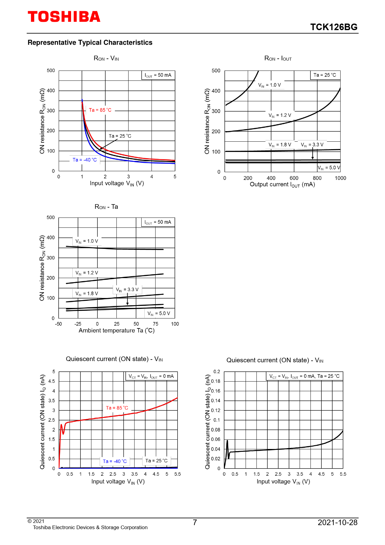 RON - VIN RON - IOUT RON - Ta Quiescent current (ON state) - VIN Quiescent current (ON state) - VIN © 2021 7 2021-10-28 Toshiba Electronic Devices & Storage Corporation